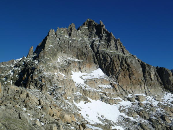 Der Schnee von den Vortagen war schon fast wieder geschmolzen, die Kletterstellen schon fast alle wieder aper. Nur die obere Gipfeletappe und das Abstiegscouloir waren noch ziemlich schneebedeckt (ca. 30 cm). Vorallem beim Abstieg ist Vorsicht angesagt. Pickel und Steigeisen sind aber nicht notwendig.