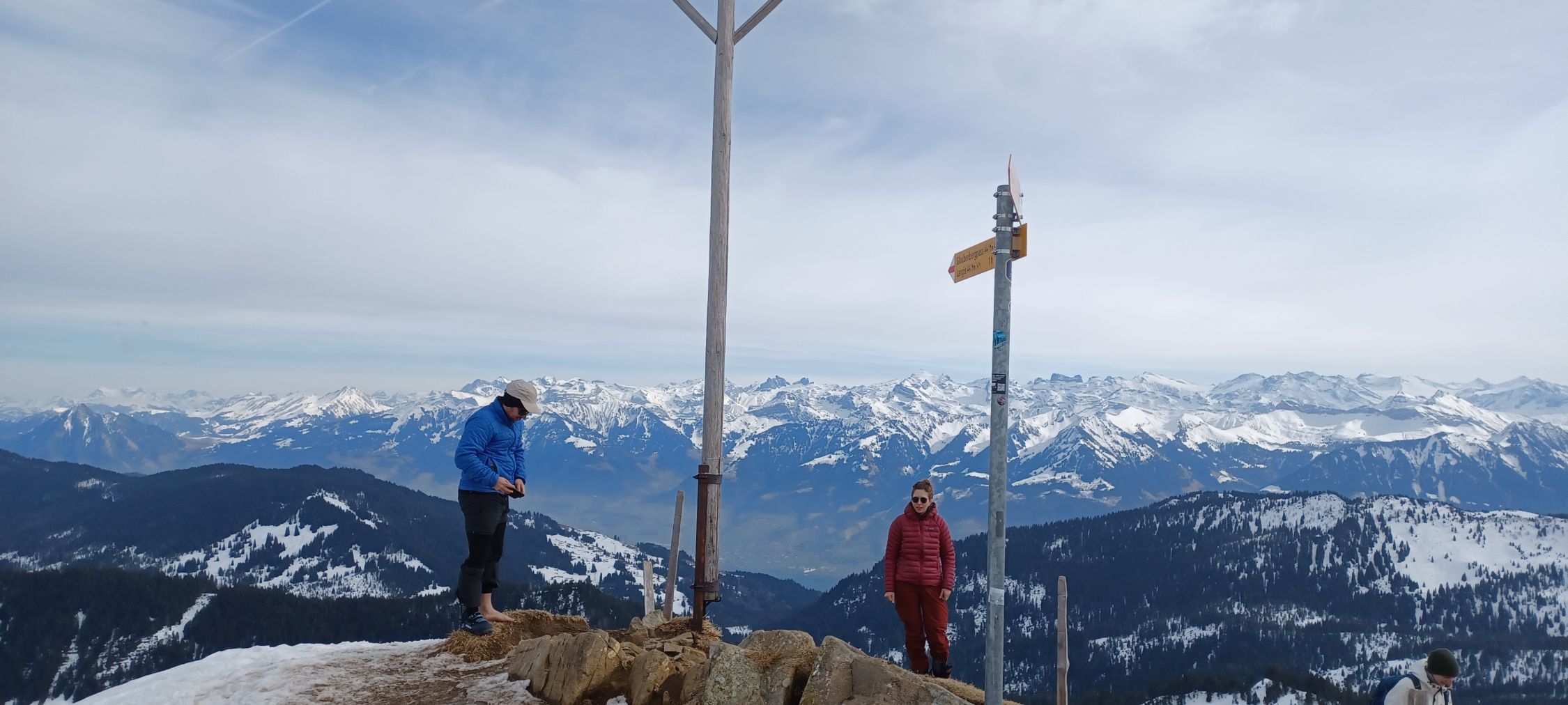 Matthias mit Schneeschuhen, die beiden andern mit Tourenski