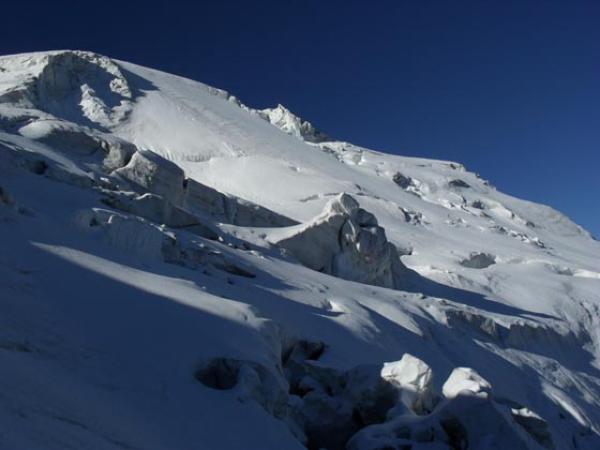 Die Schneefälle vom letzten Donnerstag deckten die blanken Teile des Gletschers gut, wobei einige Stellen bereits wieder blanke sind. Die Felsen waren trocken und ohne Steigeisen kletterbar.