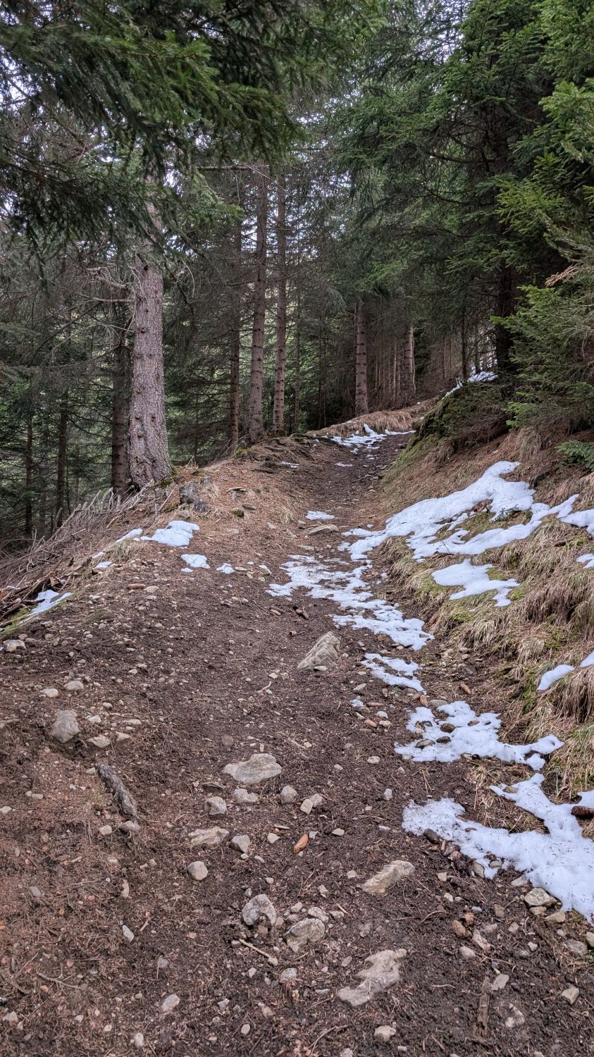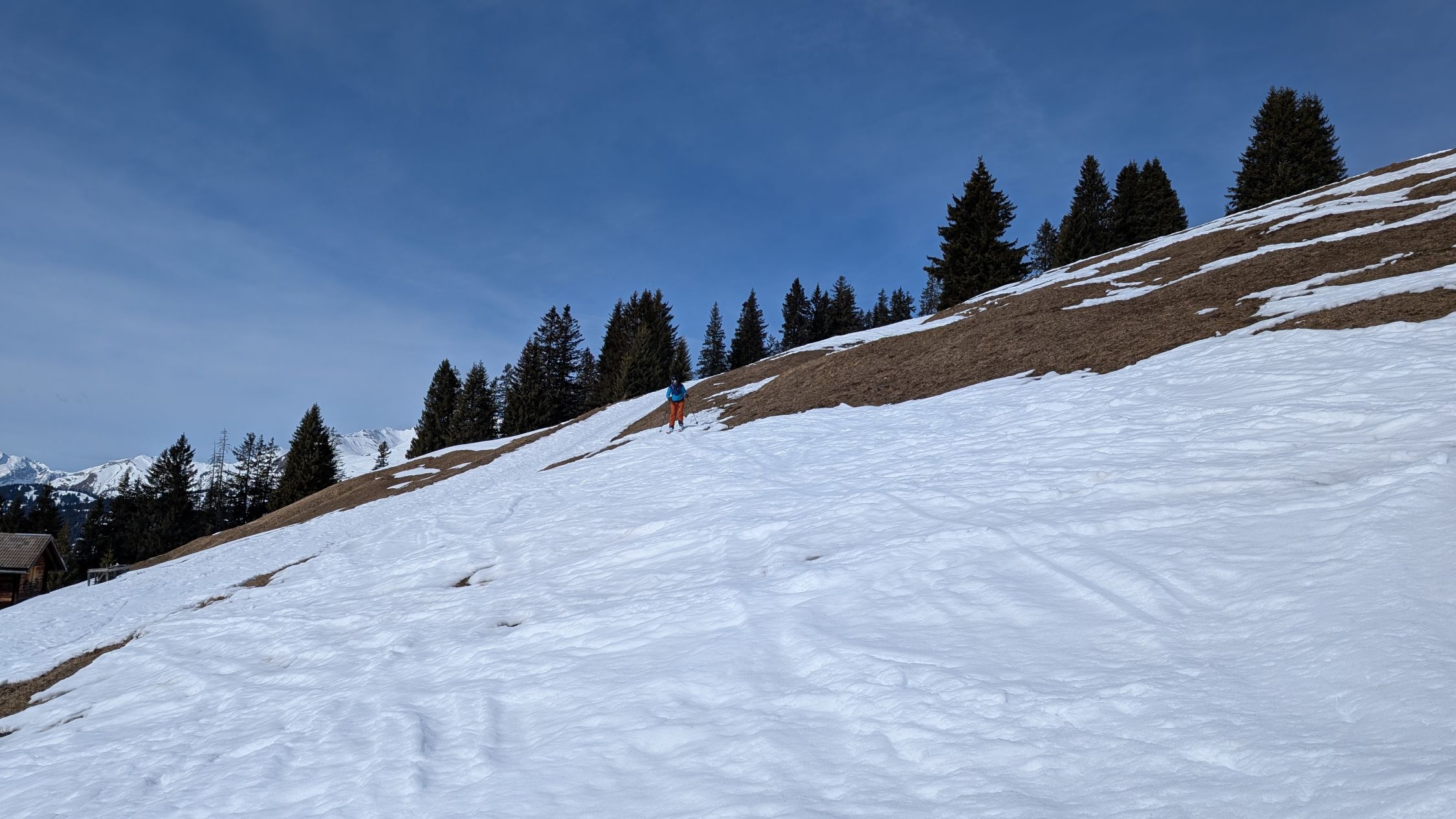 Unten wenig Schnee, oben Bruchharsch. Abfahrt um ca. 12:00 Spekulation auf weiche Verhältnisse nicht aufgegangen. Generell sehr wenig Schnee, über Sommerweg bis Pirigen zu Fuß, Abfahrt mit 3-4 Mal kurz abschnallen noch möglich.