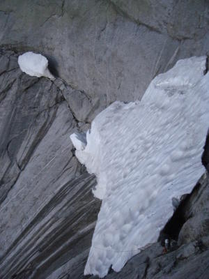 Haben auf Risiko gesetzt und sind auf Turnschuhen zugestiegen. Ohne Eisen u Pickel. Ohne den glücklichen Zufall, dass eine Seilschaft am Abend vorher ein Fixseil um den Serac installiert hatte, hätten wir vll die Nordkante klettern müssen. Das was auf dem Bild nach herunterrinnendem Wasser aussieht, ist morgens gefroren und macht die Querung ohne Eisen fast unpassierbar. Hinter dem Serac her kann man zur Zeit auch nicht. Die beste Variante war an diesem WE wohl oben drüber.