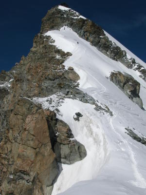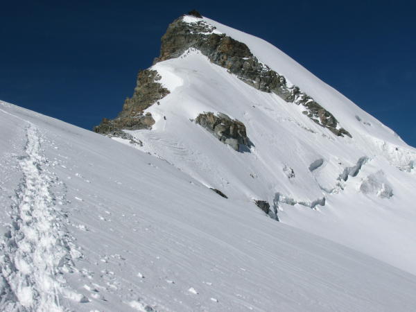 Sehr guter Trittschnee, z.T. ein wenig Blankeis darunter aber noch sehr gute Verhältnisse. Spalten gut gedeckt oder klar ersichtlich. Fels kurz unter Gipfel etwas schotterig.