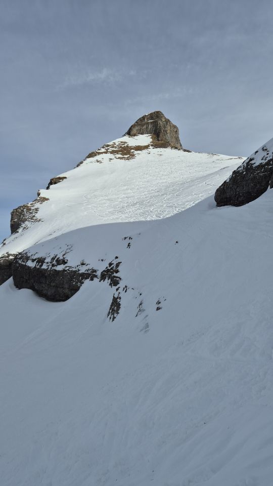 Im Wald knapp Schnee, auf der Strasse kurze Tragstrecken. Ob dem Wald dann genug Schnee. Aufstieg im Steilstück vor dem Sattel gute Spur, gut machbar. Aufstieg Gipfel, Querung tipp topp, auch nach der Querung steil hoch, Schnee gut, nicht perfekt aber gut. Oben dann grosse Wächte, sieht man gut, bereits angerissen. Problemlos aber schmal zum Gipfelkreuz.