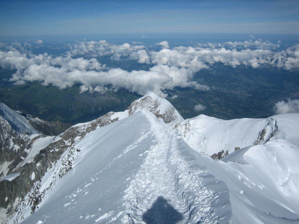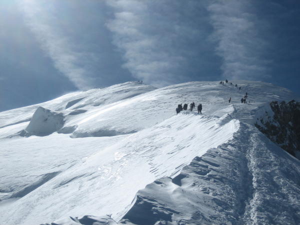 Auf dem Normalweg spielen sich immer wieder skurile Szenen ab. Beim Abstieg über die Gouter kühnen Alpinisten begegnet: eine Vierer-Gruppe machte auf einer der wenigen Gletscherspalten, die den Normalweg kreuzen, unterhalb des Dome de Gouter eine Essenspause; eine weitere Vierer-Gruppe pausierte am Rand des Grand Couloir.