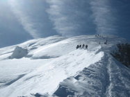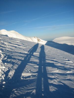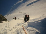 Nach dem Schneefall der vergangenen Tage reichlich Schnee im Gebiet. Gute Spur zum Tacul recht steil und interessant durch die Spalten gelegt. Leiterüberquerung auf ca. 3800m erforderlich. Hang zum Mont Maudit griffig, allerdings nach oben zunehmend härter. Steilstufe mit insgesamt 3 Fixseilen (unterhalb der Felsinsel 2). Rechtes Fixseil erreicht man zwar erst nach ca. 10m, aber auf griffigem Untergrund. Bergschrund problemlos zu passieren. Sehr starker Wind ab Col de la Brenva bis Gipfel, dadurch spuren erforderlich. Ideale Bedingungen auf Bosses-Grat. Schnee auf der Rippe (Klettersteig) unterhalb der Gouter-Hütte bis zum Couloir. Trotz Schnee im Couloir Steinschlag beobachtet.