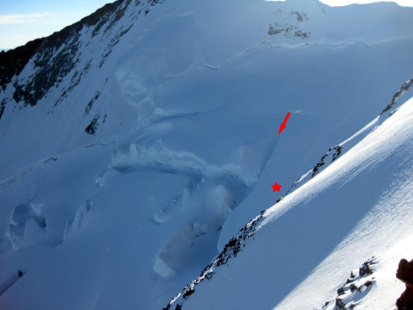 Um 6.00 Uhr morgens wurde von der Air Zermatt eine Dreierseilschaft aus dem Silbersattel ausgeflogen. Offensichtlich hatten die Leute den Spaltendurchschlupf beim Abstieg nicht erwischt: (kaltes ?) Biwak nur 50 Meter neben der Abstiegsrinne ! (siehe Foto).