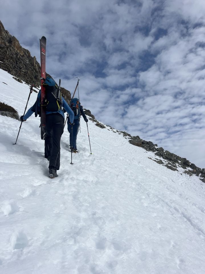 Aufstieg: Sehr bequem auf dem Hüttenweg bis zur Capanna Piansecco in ca. 45min. Es hat nur einmal 1-2m ohne Schnee, die Ski können problemlos dran bleiben. Nach kurzer Rast Aufstieg westlich des Rückens, auf dem die Hütte steht. Schnee hart, Spur aber griffig genug, um auf Harscheisen gerade so zu verzichten. Auf ca. 2.160m erreichen wir die Felsen, binden die Ski auf und queren zu Fuss die steile Flanke. Auf Fellen erschien uns das wegen des gefrorenen "Kartoffelackers" eher sehr schwierig. Nach dem zweiten Felsriegel dann auf Skiern mit Harscheisen weiter, bis die Querung bei P. 2197 endet. Über die Alpe Nuova auf griffiger, gleichmäßiger Spur ohne Harscheisen und dann weiter bis zum Skidepot. Inzwischen sehr warm, kein Wind.