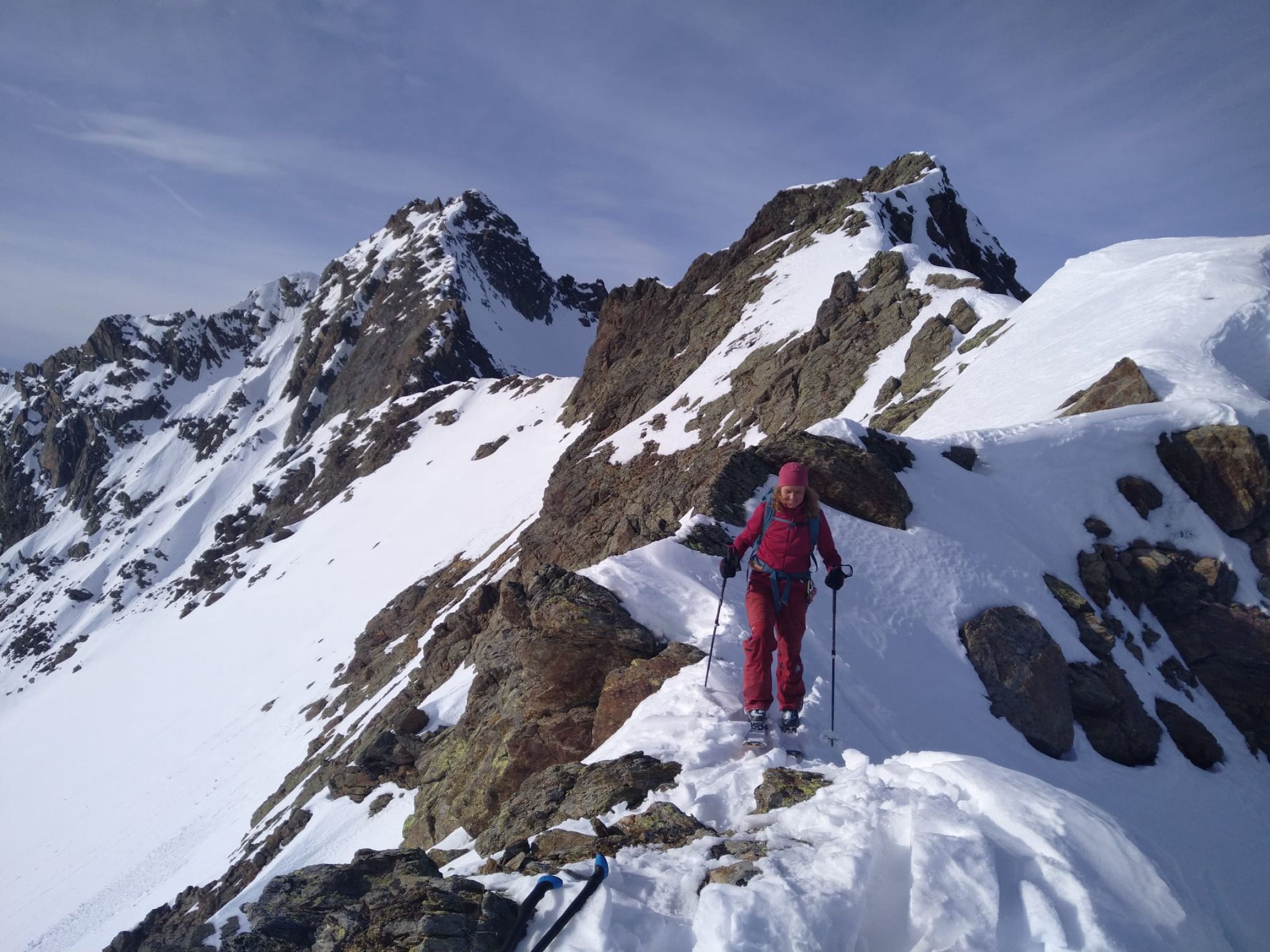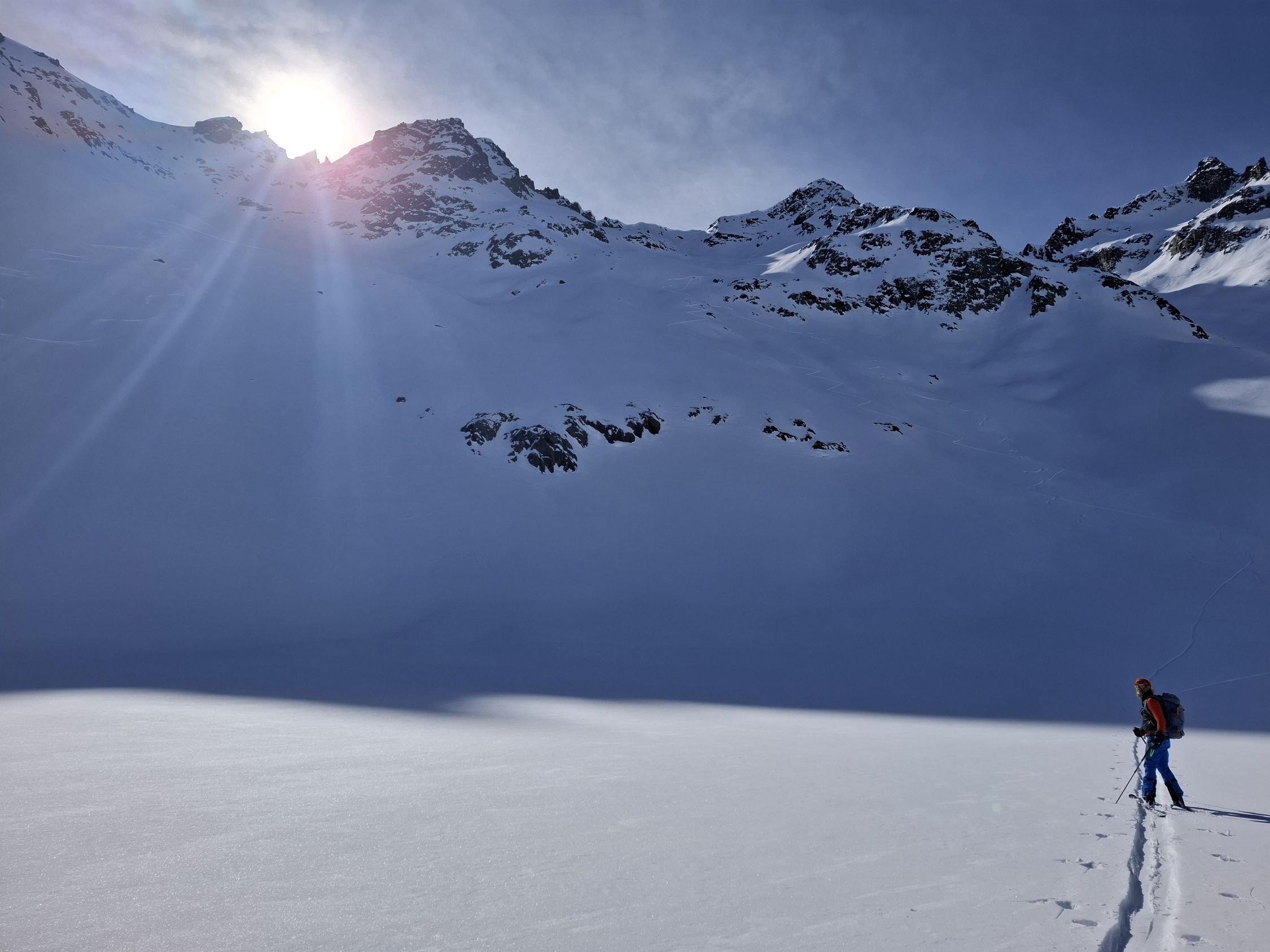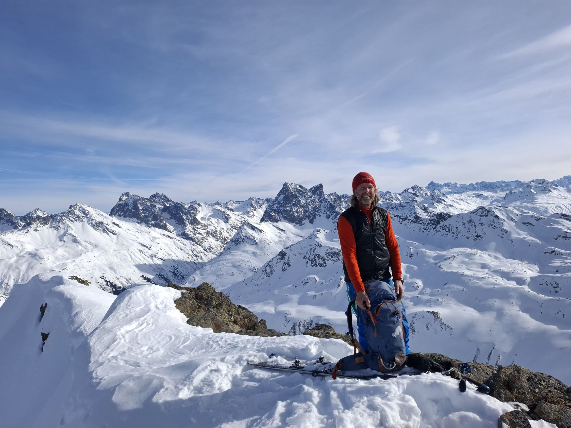 Auf präparierter Piste (sehr früh unterwegs 07:00Uhr damit wir nicht in Berührung kommen mit den ersten Skifahrern) Anstieg zum Albonagrat. Dann weiter in bereits vorhandener sehr angenehmer Aufstiegsspur zum Maroikopf (juhu schon Pulver vorgefunden) Ein Stück Richtung Stubner Albonakopf aufgestiegen und dann Abfahrt ins Maroital. Um diese Uhrzeit leider noch kein Firn. Auffellen auf 2000m und Anstieg in südliche Richtung zum Gstanskopf. Hier teilweise in eigener Spurarbeit (Pulver!!!) hinauf zum Gstanskopf, keine Harscheisen erforderlich aber es ist recht steil . Herrliche Pulverabfahrt in nördliche Richtung bis auf ca. 2200m. Dann wäre Kaltenberg der Plan gewesen, zu viele Menschen, somit sind wir auf ein Joch zwischen Kaltenberg und Gstansjöchli wieder auf 2750m.