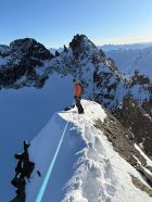 Haben letzte Woche die Kuchenspitze gemacht. Aufstieg mittels Rendelbahn, dann vorbei an der Darmstädter und sehr steil zum Gr. Küchelferner. Über eine Rinne hinauf zum Südgrat. Die Kletterei hin zum Ostgrat war aufgrund der Wächten und der stetigen Kletterpassagen (III) doch recht anspruchsvoll. Die schwierigste Kletterpassage waren dann die ca. 20 Meter am Ostgrat. Danach ohne gröbere Schwierigkeiten zum Gipfel. Dieser ist schon im Sommer selten bestiegen. Im Winter ist da kaum einmal ein Mensch oben. Abstieg wie Aufstieg. Im Ostgrat einmal 25 Meter abseilen. Der Rückweg war dann aufgrund unserer Spuren deutlich leichter, sodass wir noch im Hellen beim Schidepot waren. Abfahrt ok, aber aufgrund mittelprächtigem Schnee, Müdigkeit und Dunkelheit ein Muss, kein Genuss. Der Gipfel ist über die Westseite, vom kl. Kuchenferner (auch im AV Führer beschrieben) eher leichter zu haben, allerdings gesamt gesehen auch anspruchsvoll. Im Gesamten war diese Tour echt ein Hammer. Ein eindrucksvolles alpines Erlebnis.