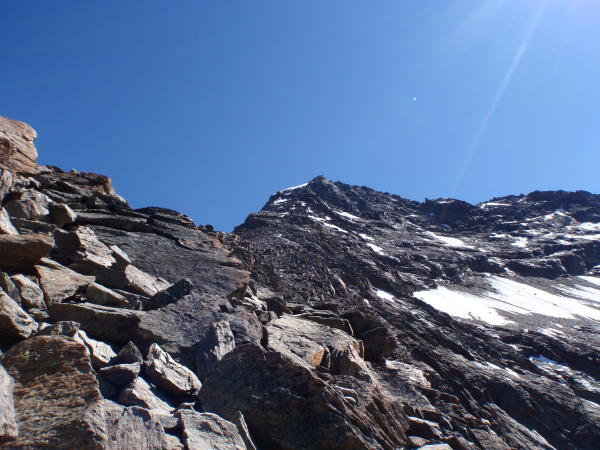 Der Fels am Grat ist trocken, erst ca. 200Hm unterhalb des Gipfels liegt noch Schnee und Wassereis auf dem "Weg". Für diese Passagen sowie das Gipfelfirnfeld sind Steigeisen momentan sicher ein Muss.