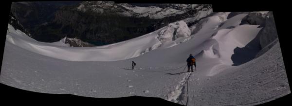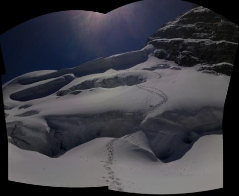 Routenführung zentral hoch. Spaltenbrücke auf ca. 3200m schmal, scheint dafür jedoch ziemlich dick. Auf 3350m etwas eingebrochen. Seraclücke geht prima.
