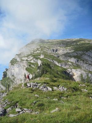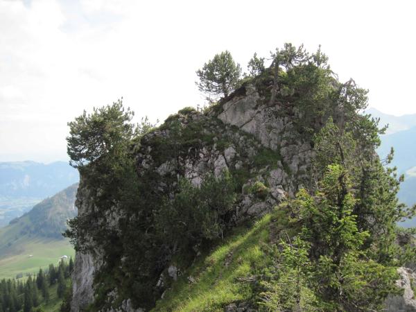 Ab P 1903 wandern wir erfreulicherweise auf dem Grat und gleich zu Beginn vom felsigen Teil muss eine leicht luftige Scharte überwunden werden (eine Sicherungsmöglichkeit, sofern gewünscht, ist am gegenüberstehenden Baum vorhanden). Weiter ist eine gut gestufte Rampe abwärts zu bewältigen. Über Rasenhänge, durchsetzt mit kleinen gutgriffigen Felsstufen und Fels-Rasenbänder kann unbekümmert aufs Wiriehorn gestiegen werden. Wir dürfen auch heute Edelweisse bewundern. Zwischenzeitlich sind Wolken aufgezogen, der Panoramablick ist folglich gemindert. Die Gipfelrast (unsere 155. Tour nach exakt 17 Monaten) halten wir im Windschatten allerdings genüsslich ab.
