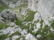 Im Abstieg, entlang dem Stacheldraht ist bald unterhalb, links vom Zaun ein Steinmann ersichtlich. Da gehts also runter. Der zweite Steinmann weist die Richtung und in Einserkletterei kann in die schön gestufte, leider nur kurze Runse abgestiegen werden.