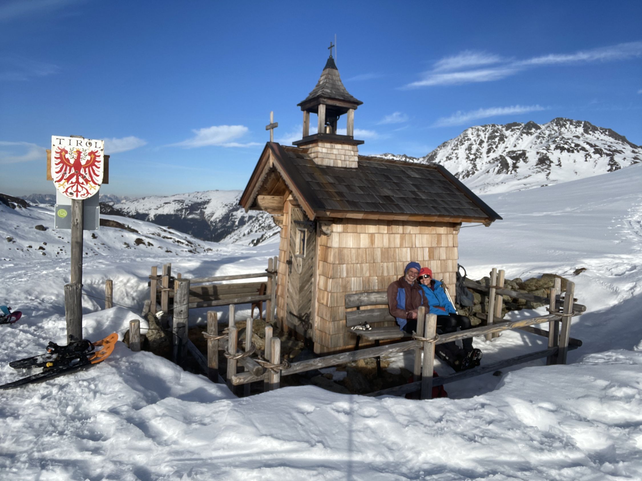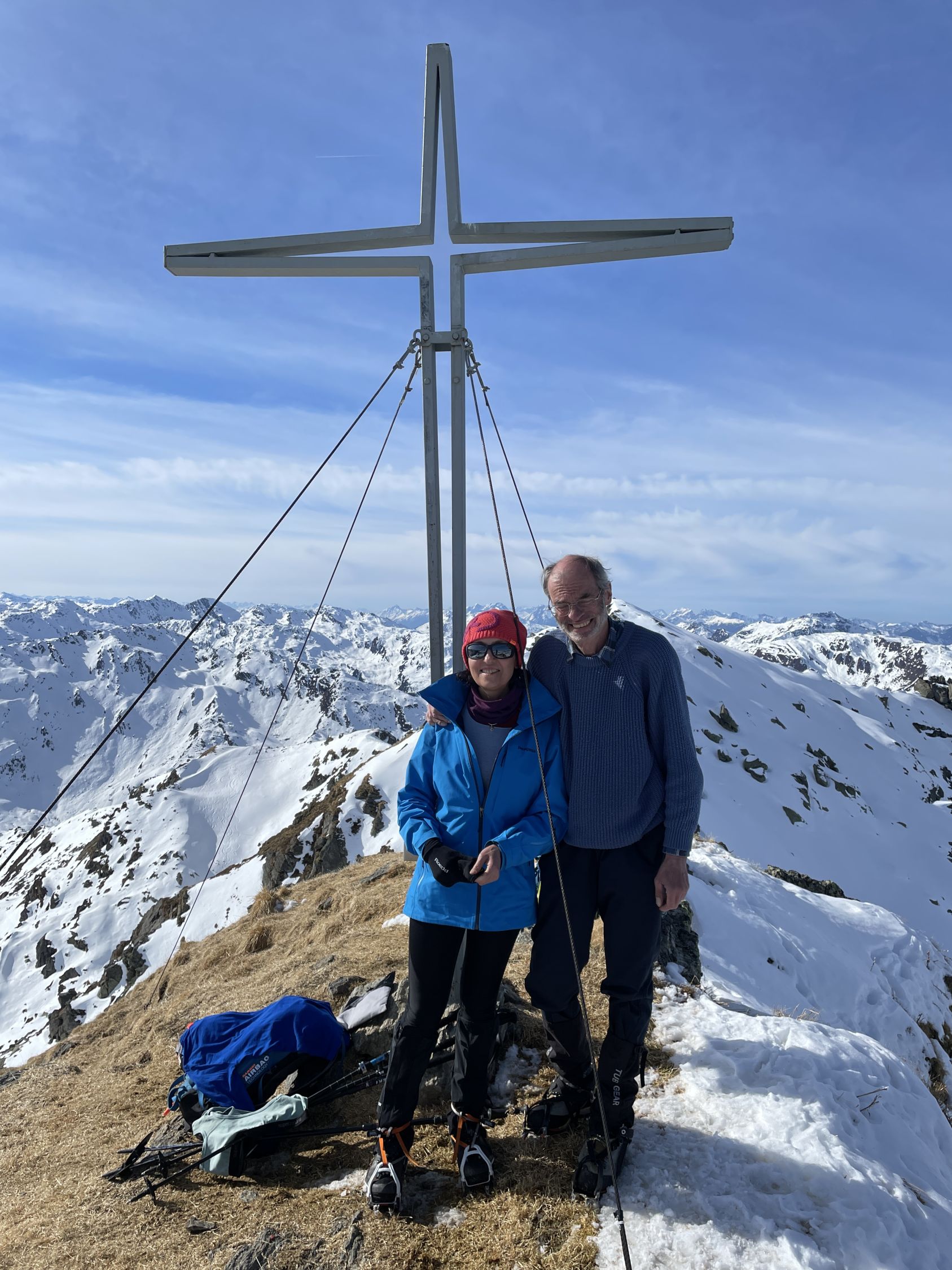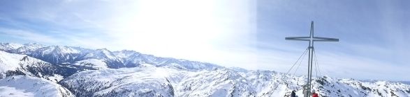 Der Gipfel ist ein Aussichtspunkt auf die Zillertaler Alpen und Hohe Tauern. Wetterverschlechterung (Niederschlag, Abkühlung) ist angesagt. Im Abstieg bei Rast am Markkirchl beobachteten wir schöne Regenbogen-Farben in einer Wolke.