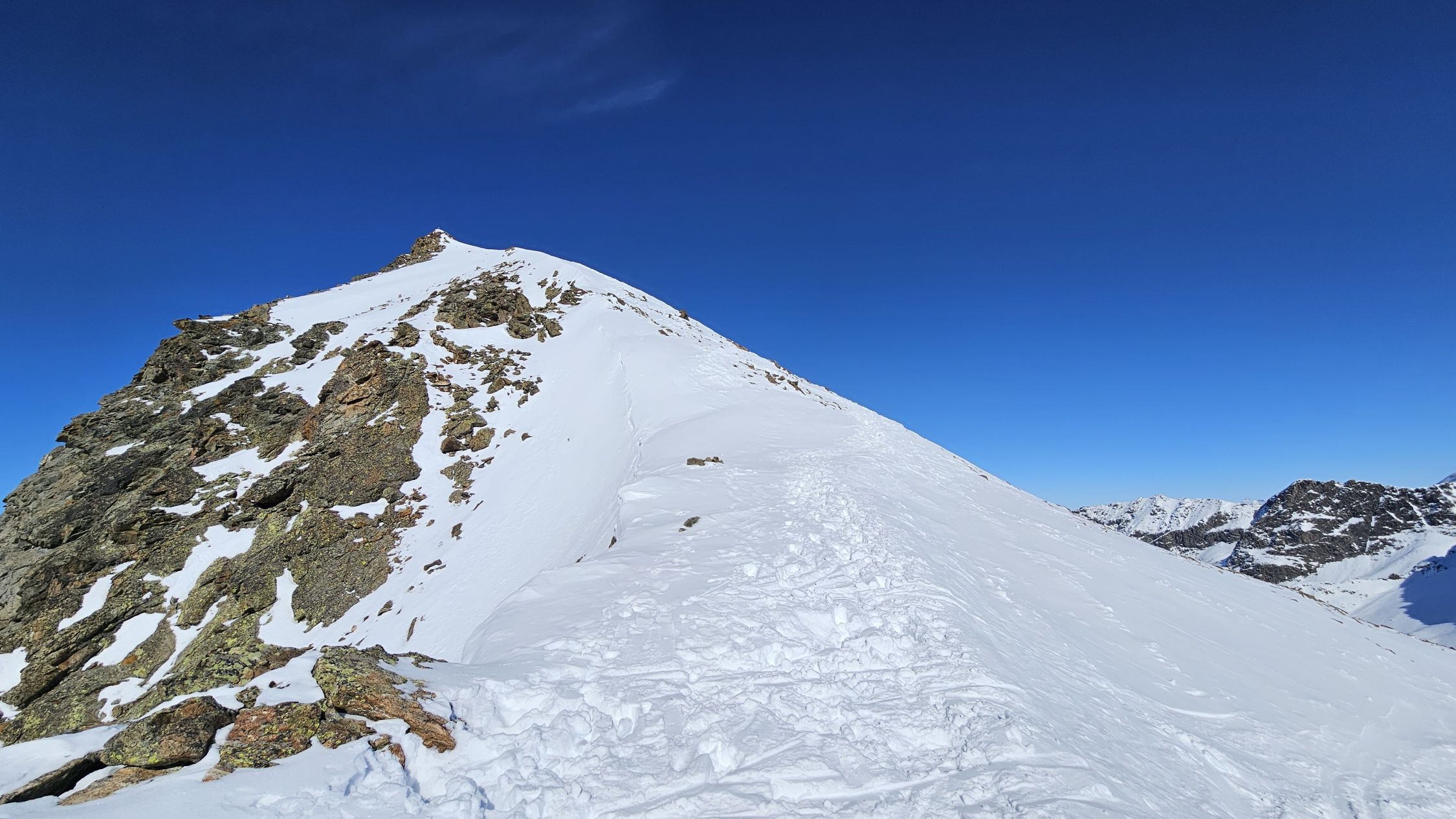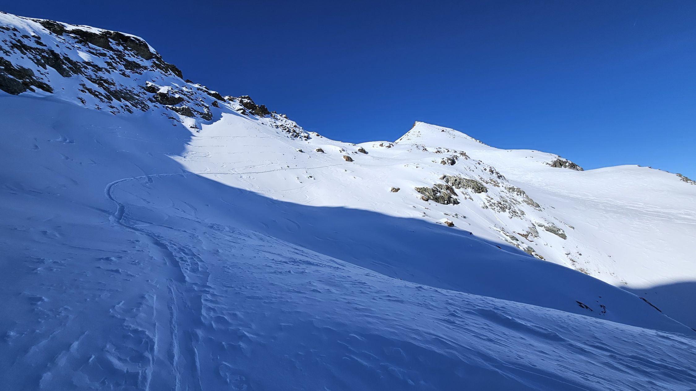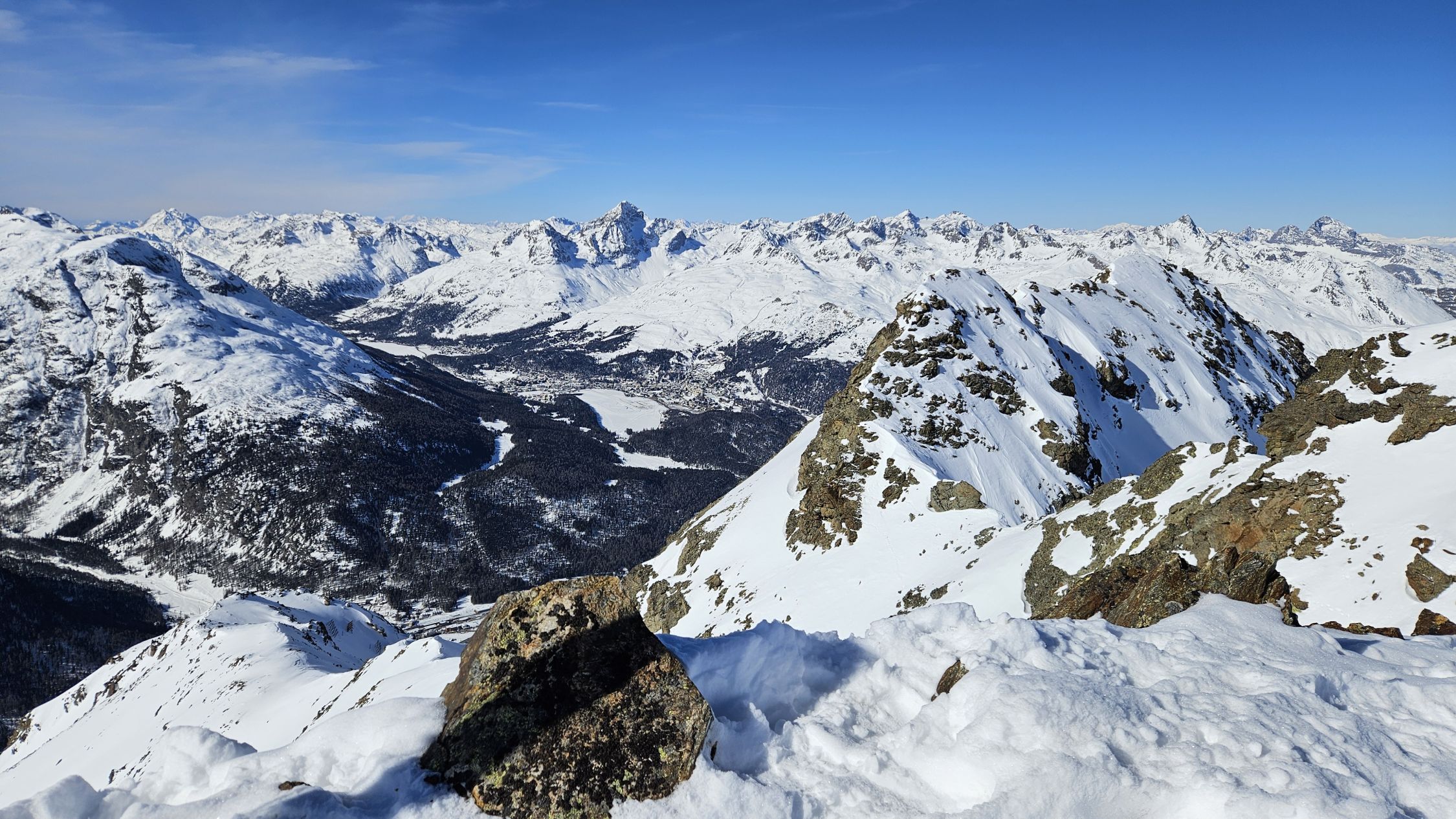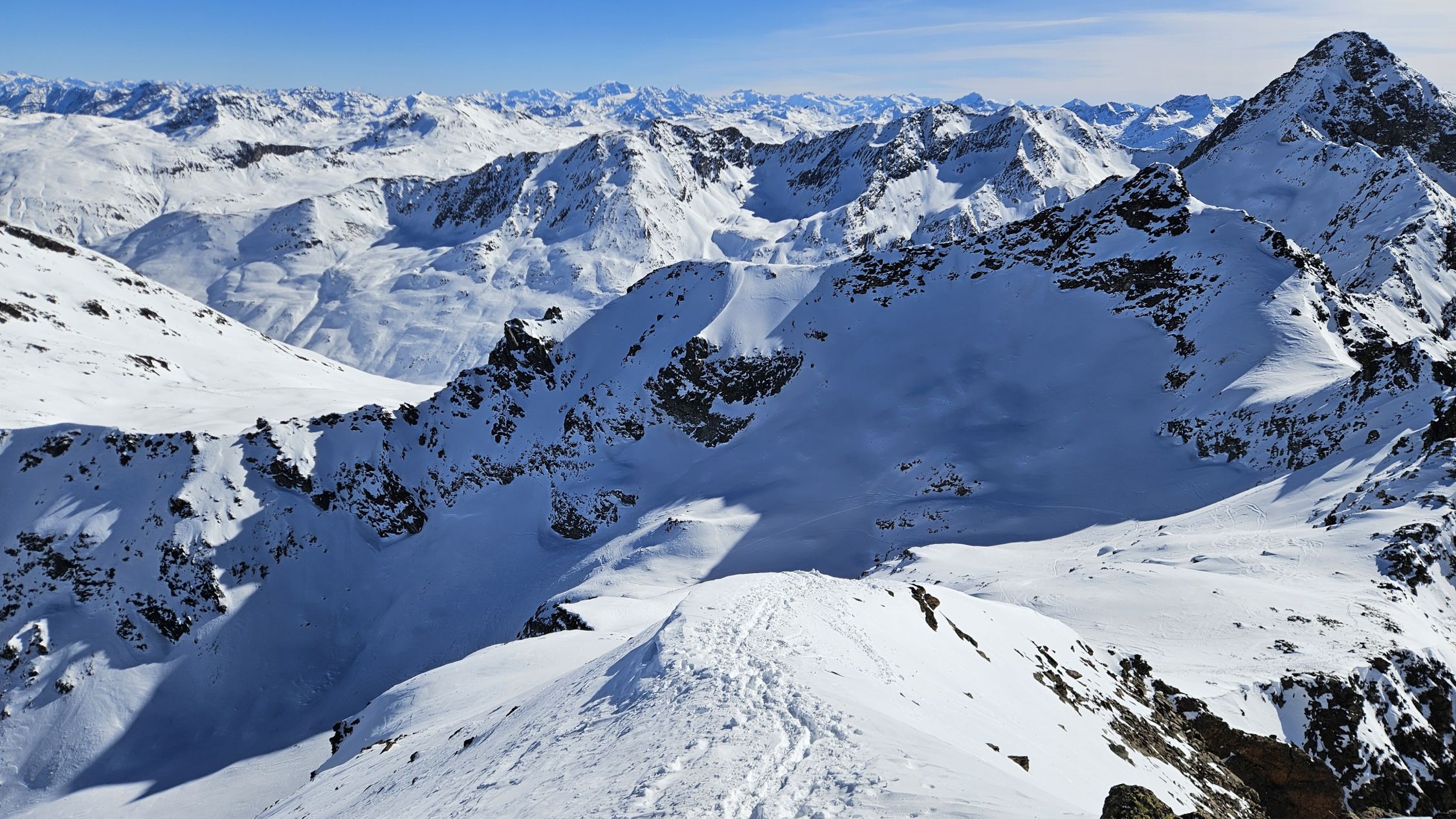 Gute Spur vorhanden und guter Trittschnee auf den Gipfel (Pickel und Steigeisen aktuell nicht nötig). Im oberen Teil und im Val Muragl mehrheitlich Pulver, insbesondere an Nord-exponierten Hängen bzw. Stellen.