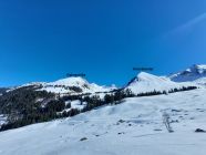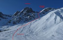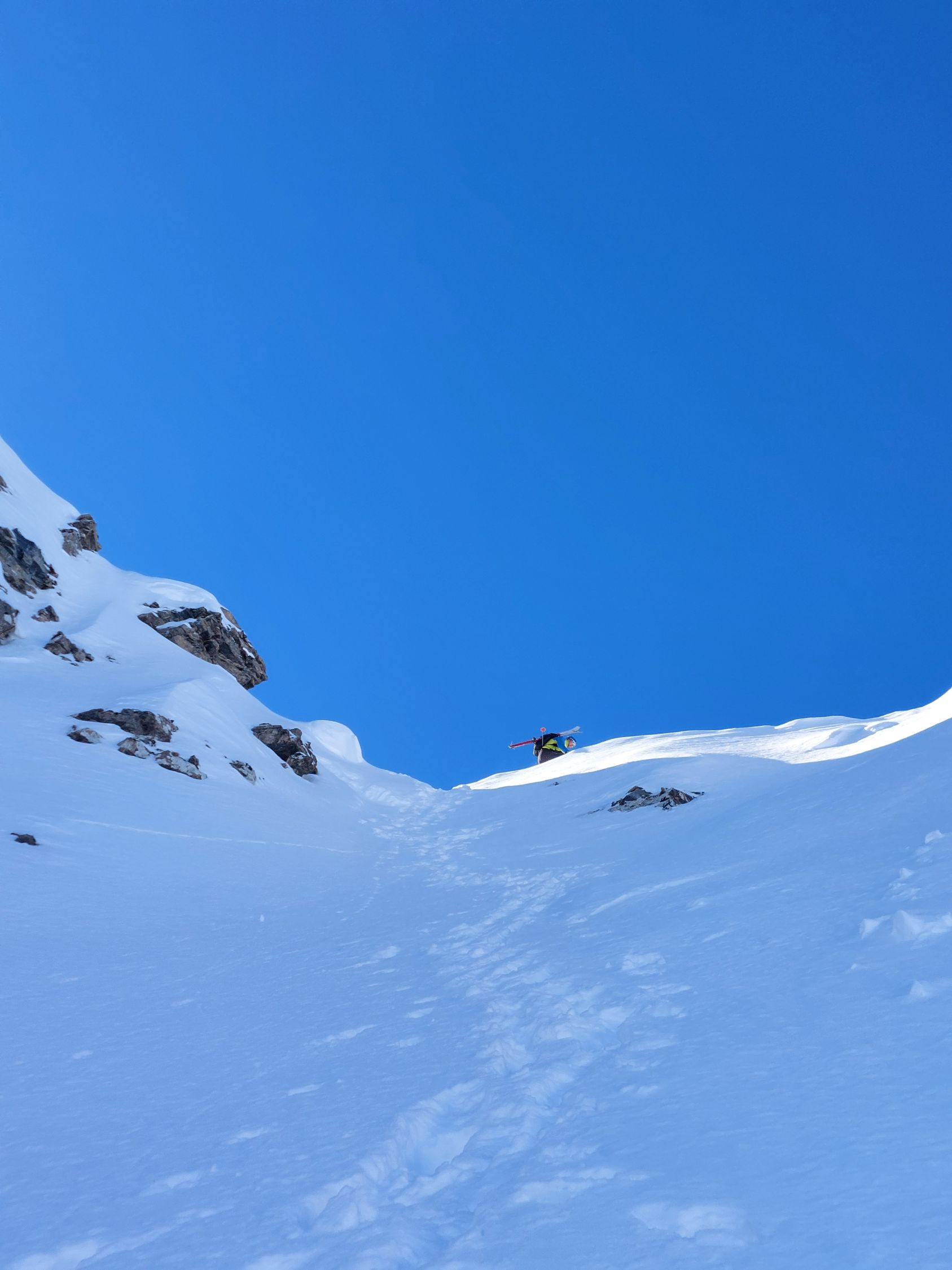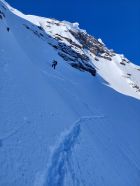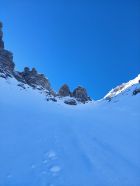 Es hat wenig geschneit. Auf 1800m ü. M. hat es Ø ca. 6 - 7cm Neuschnee, nach oben zunehmend. In den Mulden hat es wesentlich mehr. Im Couloir 2100m ü. M. bis zum Grat hat es Pulver auf guter Unterlage. Es hat jetzt eine gute Spur. Die letzten 50Hm bin ich zu Fuss aufgestiegen.