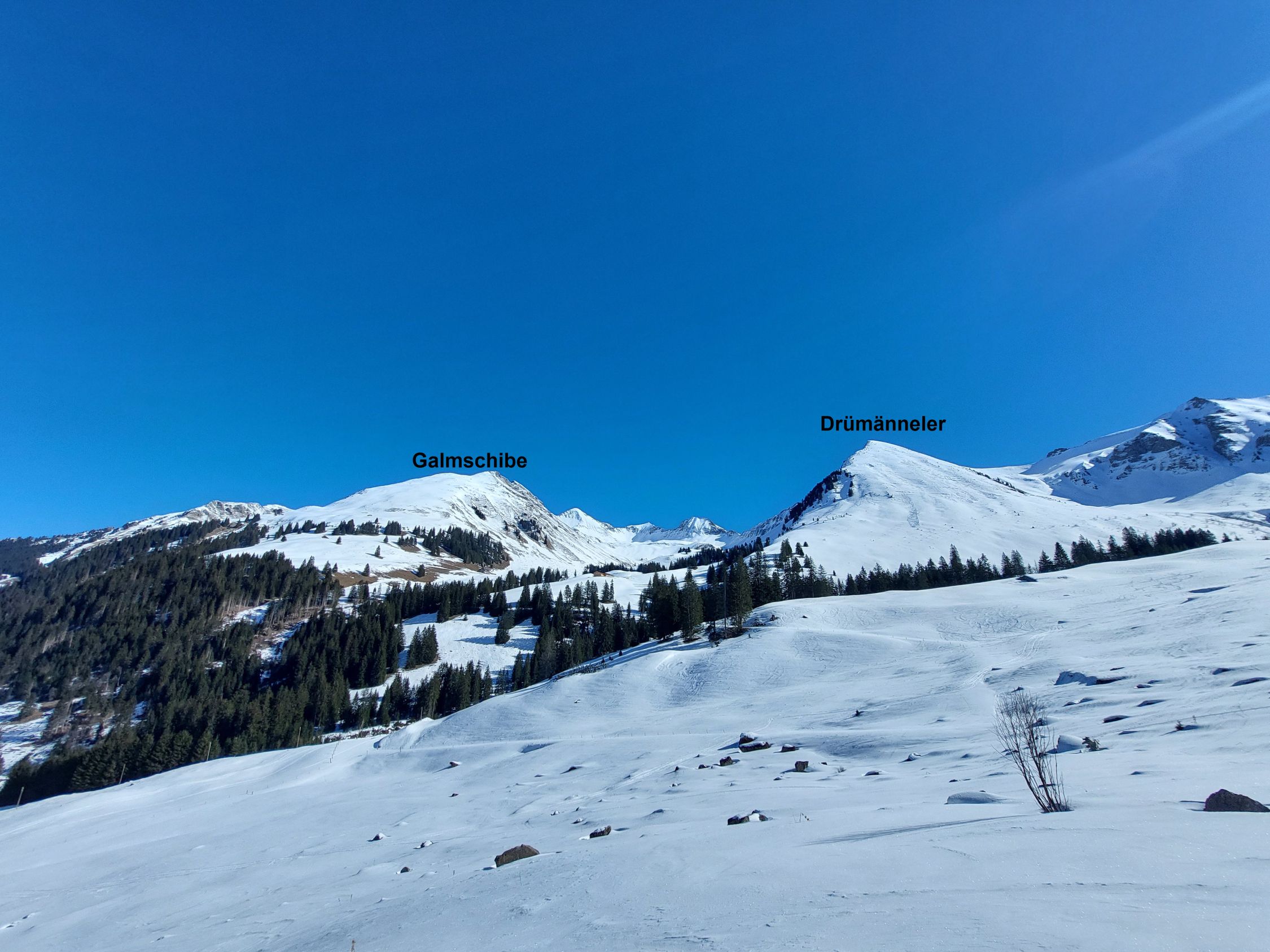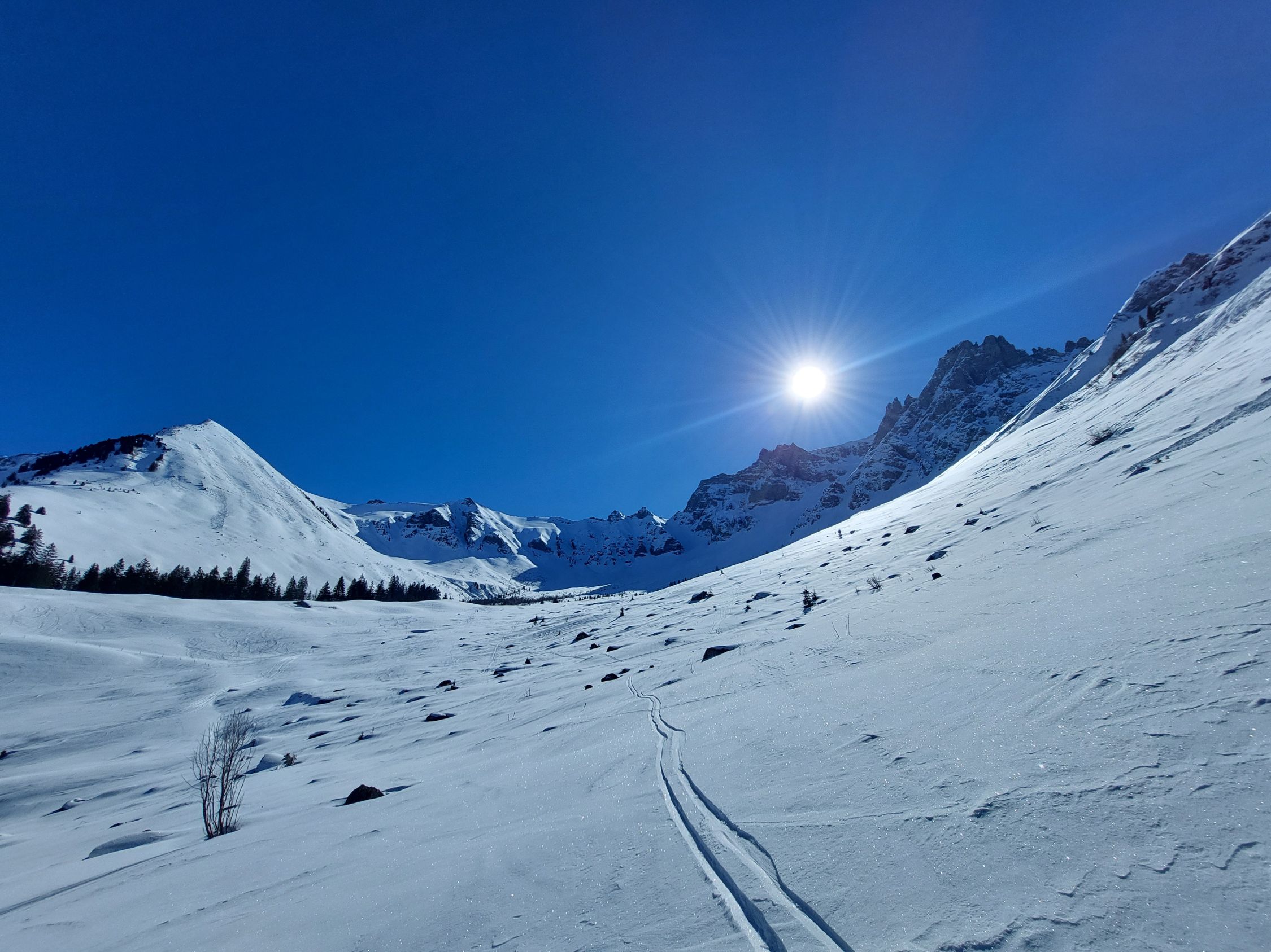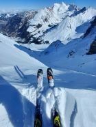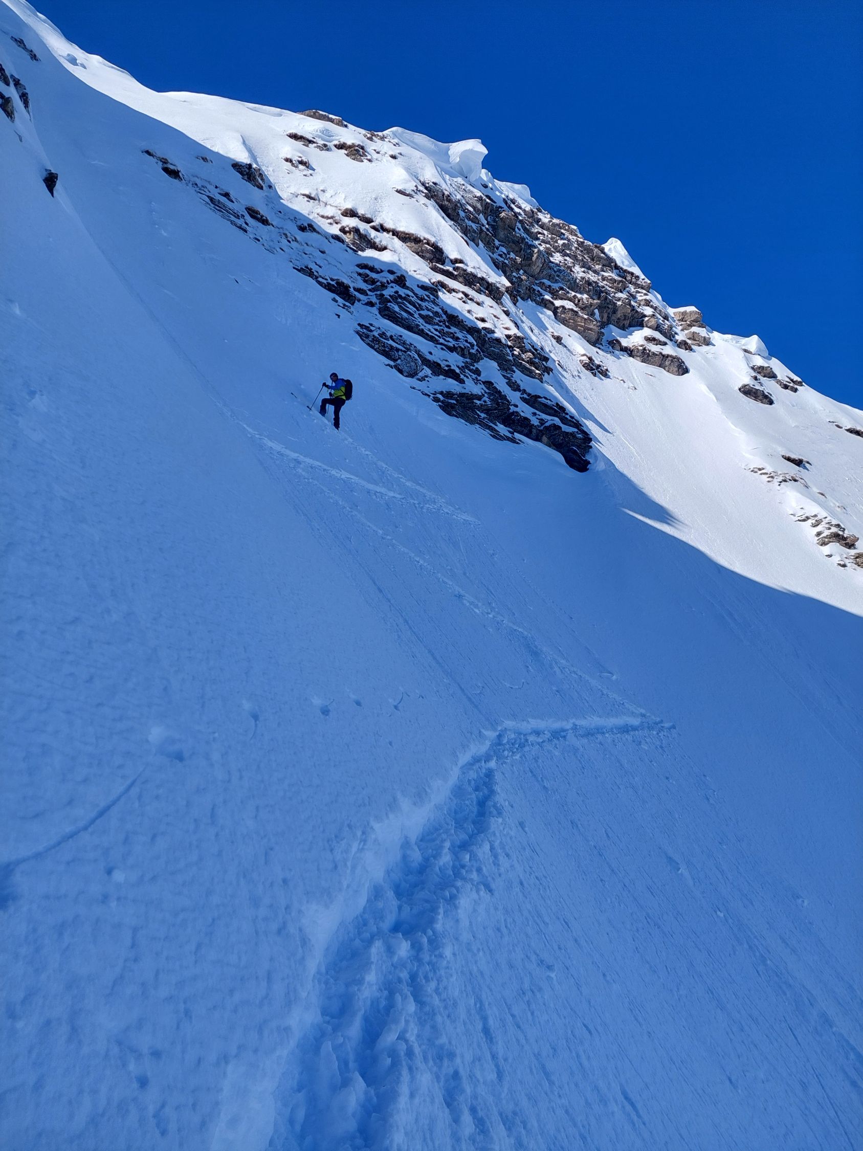 Abfahrt: Man kann direkt vom Grat abfahren. Unterhalb des Couloirs habe ich in die sonnenbeschienenen Hänge traversiert. Dort hat es Pulver bis zum Steibode hinunter.