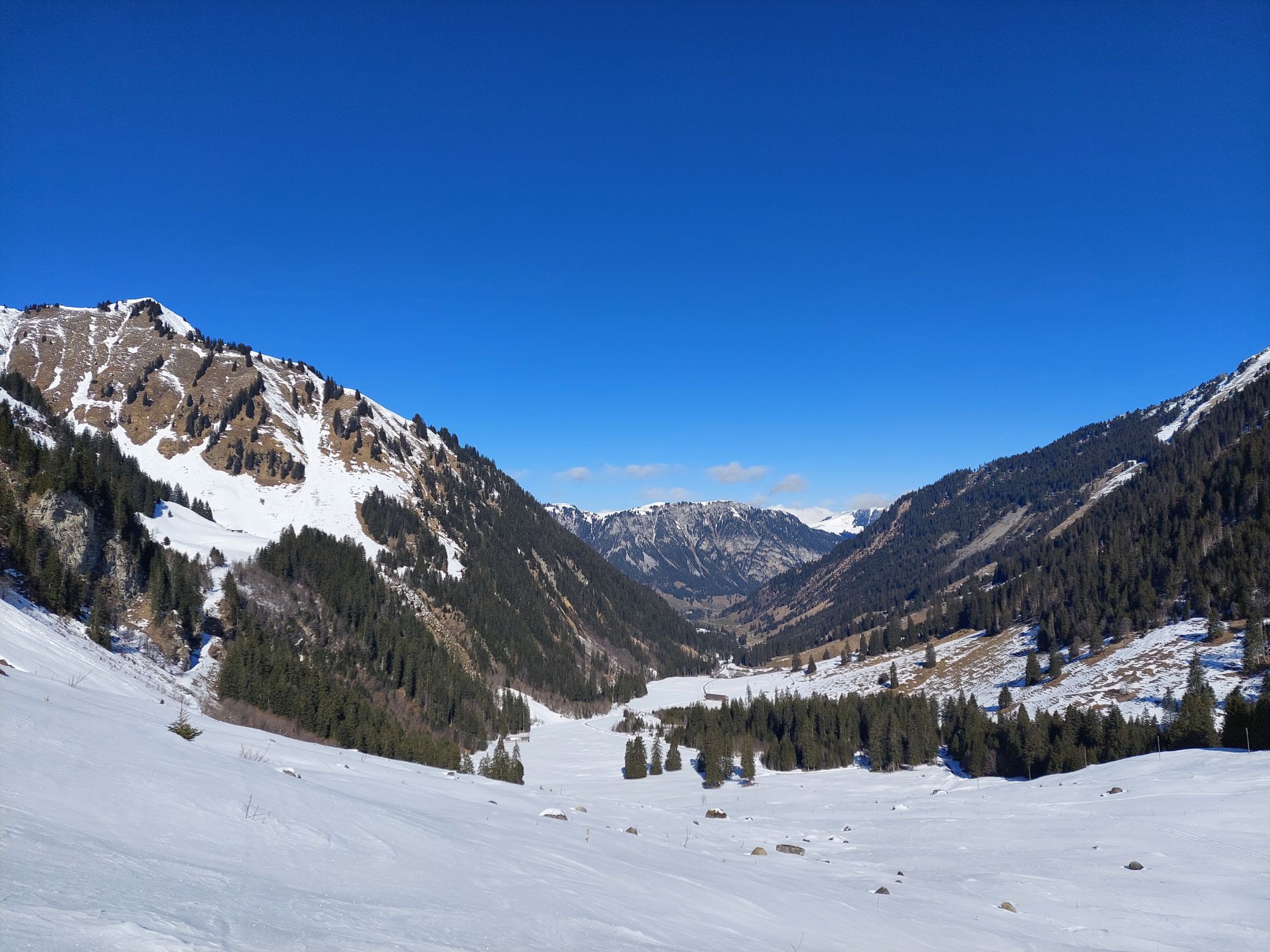 Der Steibode ist hart und hat viele alte Spuren. Es hat Schnee bis zum Parkplatz.