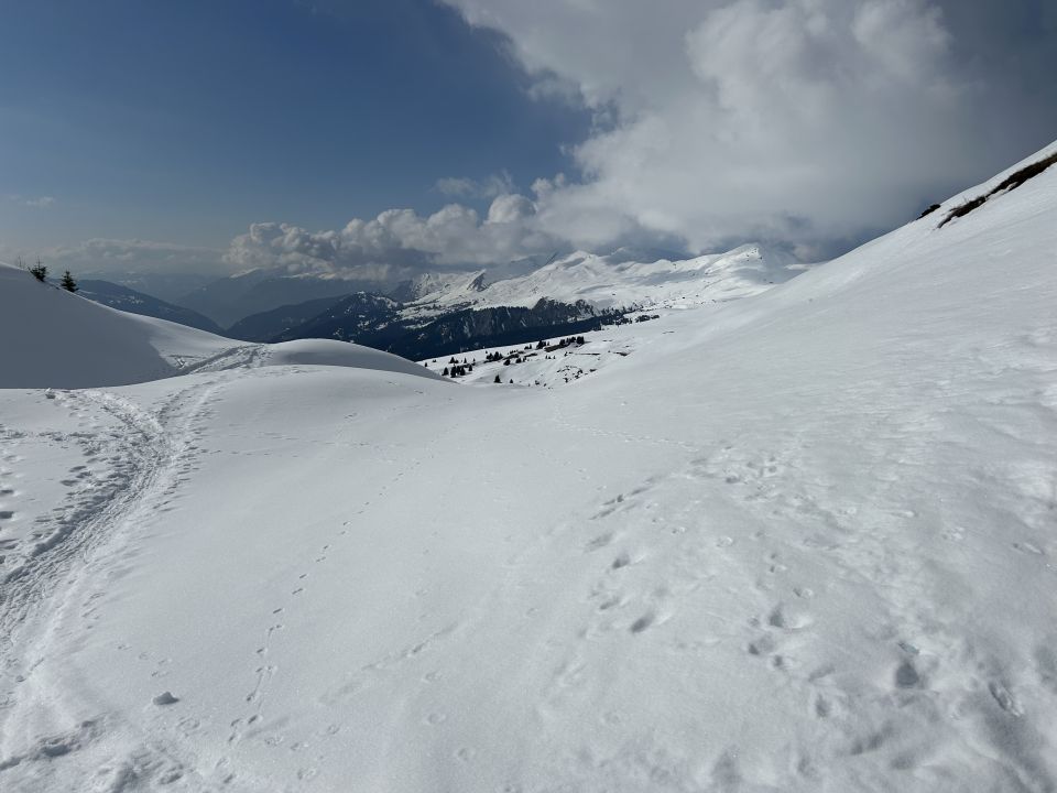 Von ca. 1800m bis zum Gipfel gute Schneeverhältnisse. Ich bin vom Gipfel zum Skihaus Casanna abgefahren, schön zu fahren, Mischung aus Pulver und leichtem Sulz. Gut drehend und es gibt kein Risiko, Steine zu erwischen. Einkehr im Skihaus Casanna und von dort zur Blackter Fürggli und hinab nach Langwies. Ab ca. 1500m war Skiertragen angesagt.