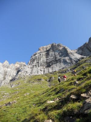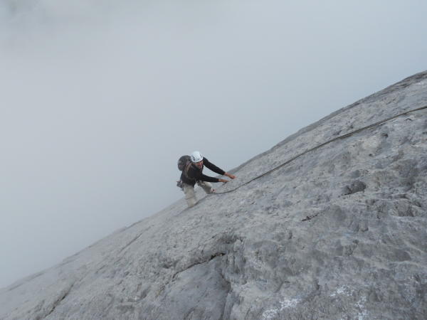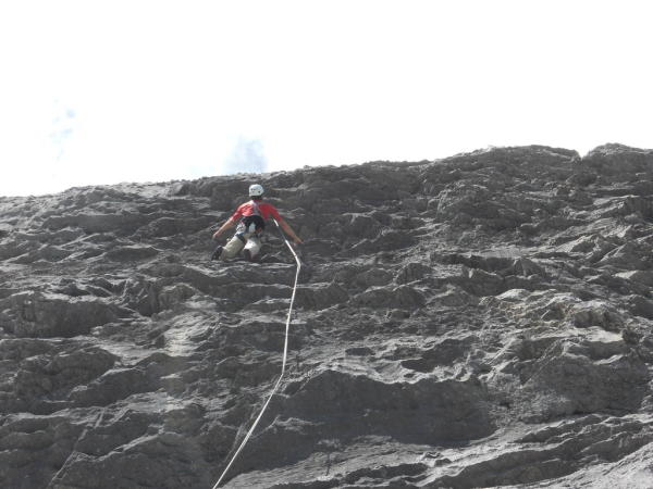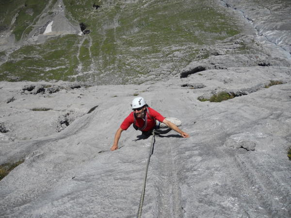Bis und mit SL 8 fanden wir die Bewertung passend. SL 9 bietet eine harte, steile Platte mit kleinen Griffen und schlechten Tritten, meiner Meinung nach eine harte 7a, nicht 6c. Die nominelle SL 10 führt über eine ziemlich glatte Platte mit wenigen, kleinen Schüpplein. Es sah so aus, als ob an einer entscheidenden Stelle ein solches ausgebrochen ist - daher fand ich 6c+/7a dort auch passender.