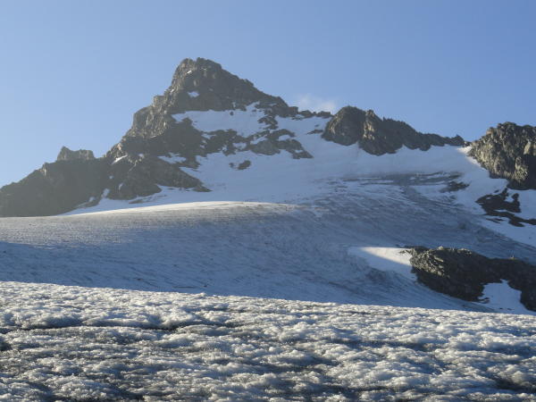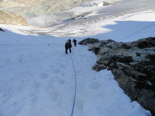 Optimale Verhältnisse. Gletscher Aper. Kaum Spaltengefahr. Schneeflanke Trittschnee. Fels Schneefrei.