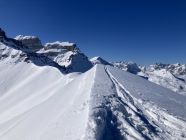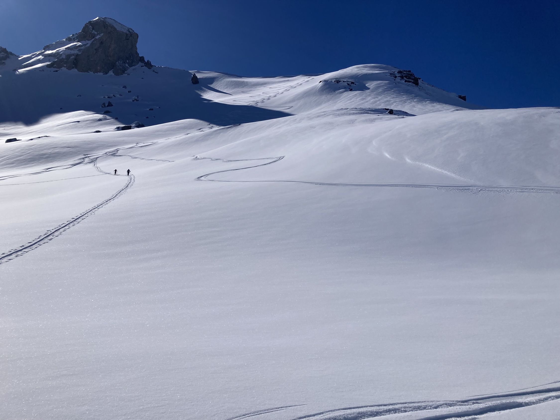 Den Rossgrat durfte ich heute anspuren, es hatte von gestern zwei Abfahrtsspuren gen Galtenebene, die Person sind wie auch zwei weitere welche heute Aufstiegen von Alplen (vermutlich durch den Tunnel gekommen, es hatte zum Tunneleingang eine bzw. Zwei Spuren).
