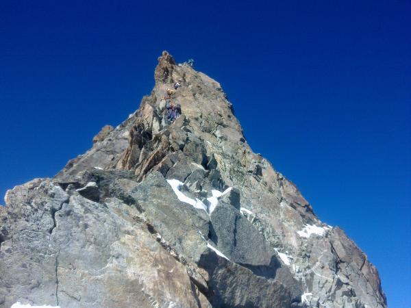 Auf dem Glacier de Tsena Refien konnten wir in gutem kompaktem Eis mit den Steigeisen hochsteigen. Am Col de Serpentine und weiter am Ostgrat zu war Trittschnee. Die Kletterei am Grat in kompakten Felsen war ein Genuss. Ein paar Schlingen genügen zur Absicherung. Nach der Abseilstelle in der Mitte des Grates konnten wir in warmen Felsen weiterklettern.
