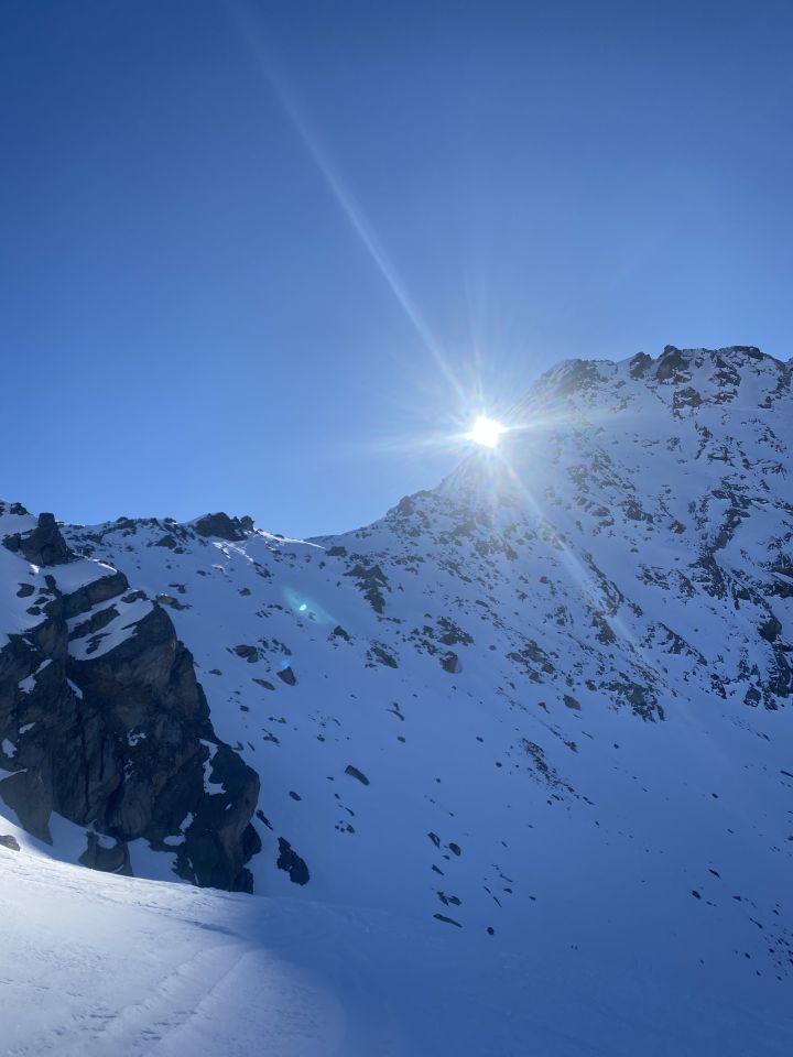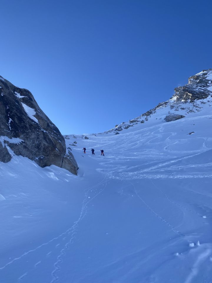 Ab Tschuggen schneebedeckte Straße bis zum Abzweig. Im Gebiet leider für die Jahreszeit zu wenig Schnee - im Aufstieg muss zwischen den Felsblöcken durchjongliert werden (so wenig Schnee um die Zeit habe ich bisher nicht erlebt). Aufsteigspur bis zum Skideopt sehr gut zu gehen. Nordostkante hat wenig Schnee, aber gute Tritte (Steigeisen heute nicht erforderlich). Abfahrt über Jörigletscher zum Jörisee mit gutem Pulverschnee (z.T. leicht vom Wind bearbeitet). Gegenaufstieg problemlos. Die Abfahrt über die Hänge des Jörihorn bietet sehr wechselnden Schnee. Schneedecke ist leider noch nicht wirklich zu Firn verwandelt. Dennoch lohnende Tour !