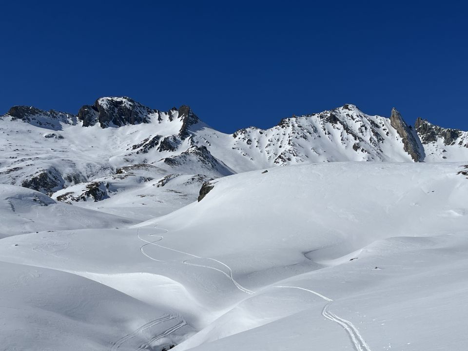 Dort wo die Route von Bivio zusammenkommt waren weitere Spuren zu sehen, sehr wenige Leute im Gebiet, herrlich ruhig. Ca ab. 2200 in den Osthängen noch schöner Pulver vorhanden. Bis zum Sattel war super gespurt, keine HE benötigt. Nach dem Sattel ist alles verblasen und wenig Schnee bis zum Skidepot. Wir sind dann in gutem Trittschnee hochgestapft Ski aufgebuckelt, ein besonders motivierter hat es aber mit Ski bis zum Gipfel geschafft, sieht ganz okay aus die Spur, aber uns war es lieber die direkte Route zu nehmen. Der Gipfelgrat ist trocken und Schneefrei, super zum gehen. Abfahrt dann über das Ost Couloir durch windgepressten Pulver und teilw. Bruchharsch. Die Aufstiegsroute wäre schneemässig heute sicher besser gewesen aber wir wollten uns die Variante mal anschauen.