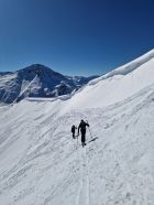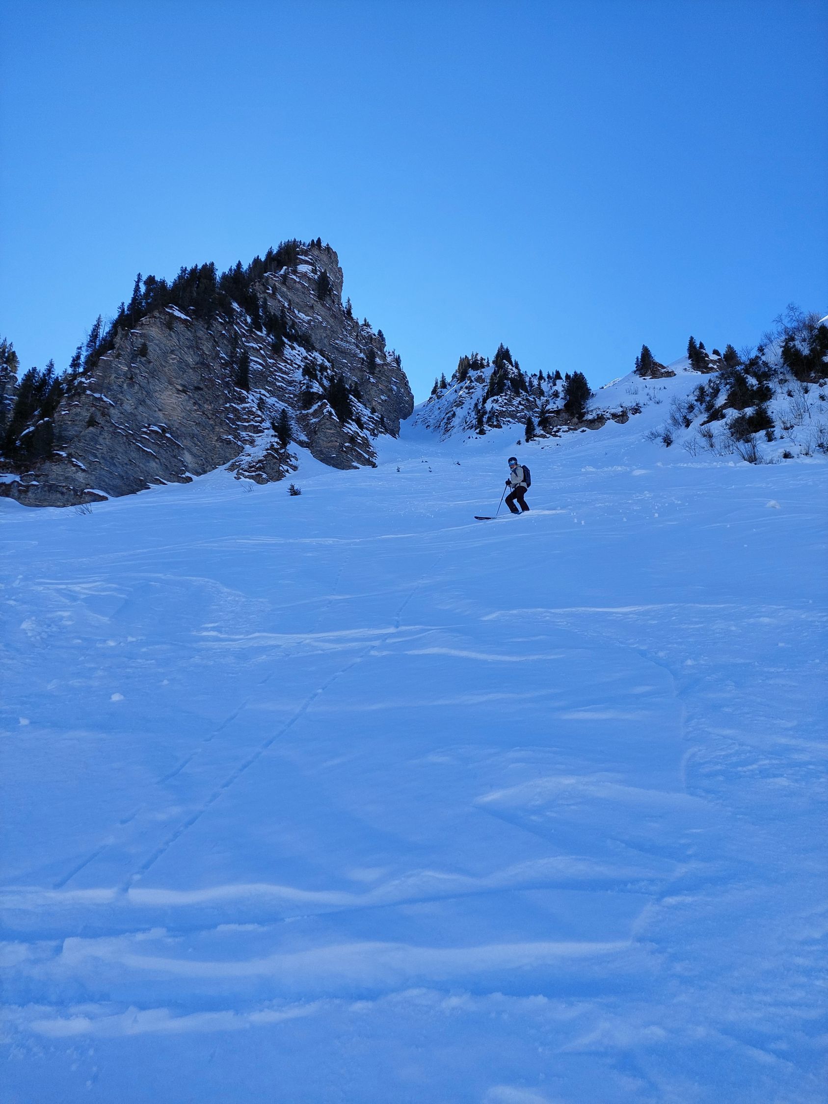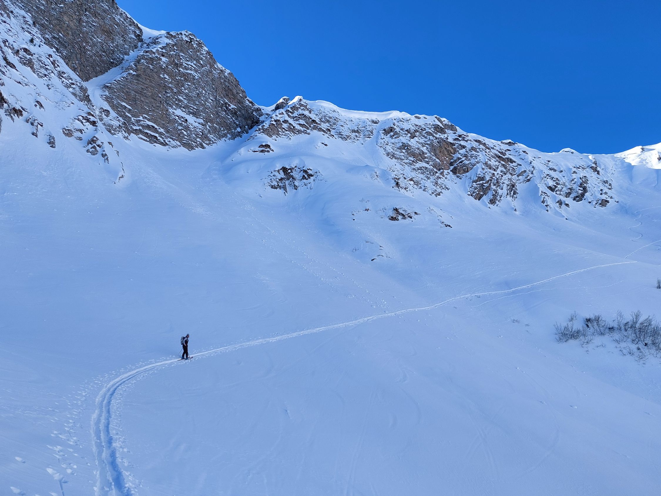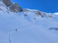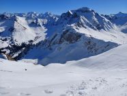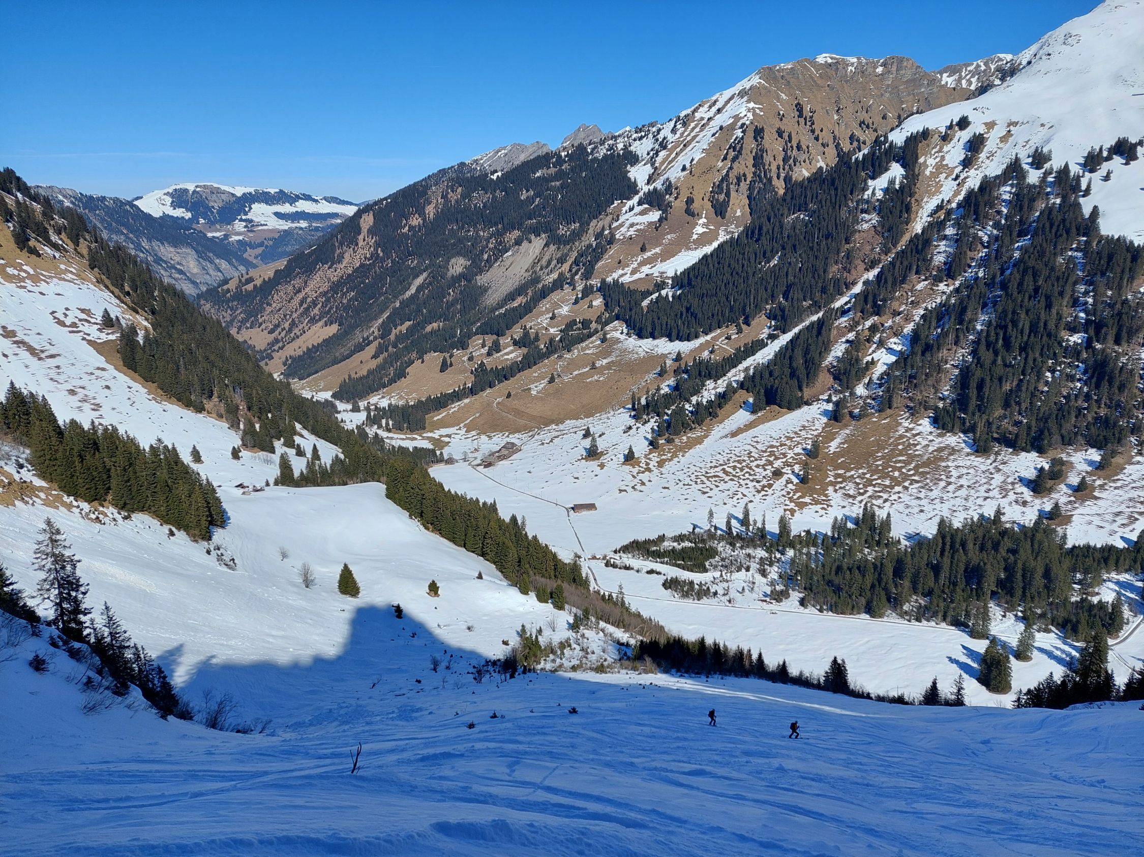 Abfahrt: In der Gipfelflanke hat es schönen Sulz. Nach der ersten Querung (Höhe 2150m ü. M.) hat es Pulver bis zur zweiten Querung (Höhe 1800m ü. M.). Der letzte Hang bis zur Strasse ist hart und mit Lawinenknollen übersät, aber fahrbar. Der Rest, Strasse bis Steibode und Steibode bis zum Parkplatz, ist pistenähnlich.