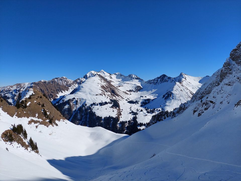 Abfahrt: In der Gipfelflanke hat es schönen Sulz. Nach der ersten Querung (Höhe 2150m ü. M.) hat es Pulver bis zur zweiten Querung (Höhe 1800m ü. M.). Der letzte Hang bis zur Strasse ist hart und mit Lawinenknollen übersät, aber fahrbar. Der Rest, Strasse bis Steibode und Steibode bis zum Parkplatz, ist pistenähnlich.