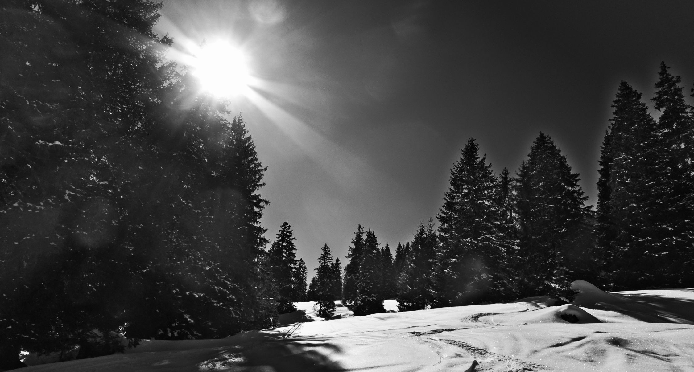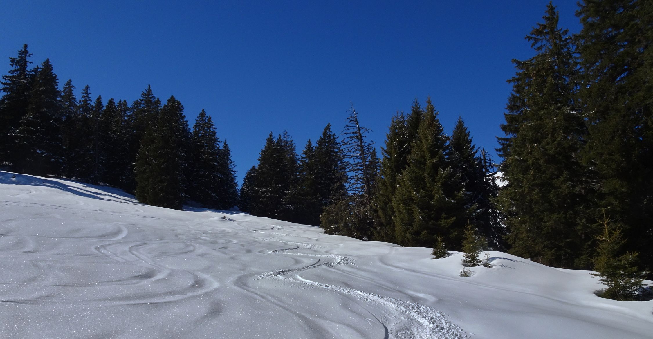 Wir sind am Schwarzenberg auf bis zirka 1200 müM hinaufgefahren. Das geht mit einem Allradfahrzeug recht gut. Ab dem Parkplatz mit Ski aufgestiegen und auch wieder abgefahren. Es hat etwa 10-20cm Neuschnee gegeben, der heute wunderschön zu fahren war.