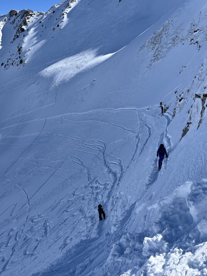 Der Einstieg in die Nordabfahrt ist vom vielen Abrutschen hart und nicht so toll zum Fahren. Weiter unten hat's Pulverschnee; durch geschickte Routenwahl kann das zerpflügte Gelände gut umfahren werden.