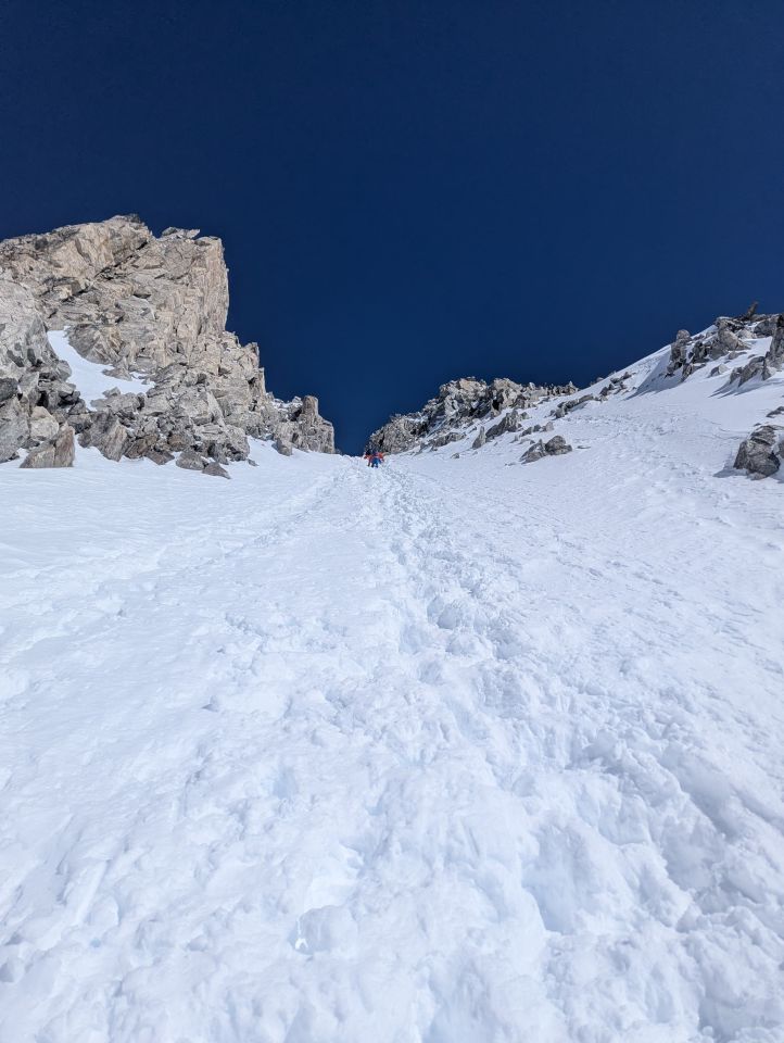 Im Coloir unten eine eisige Stelle mit Felsen, danach guter Stapf-Schnee mit Spuren. Mit Pickel und Steigeisen gut begehbar.