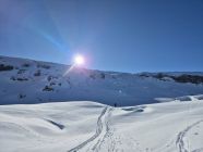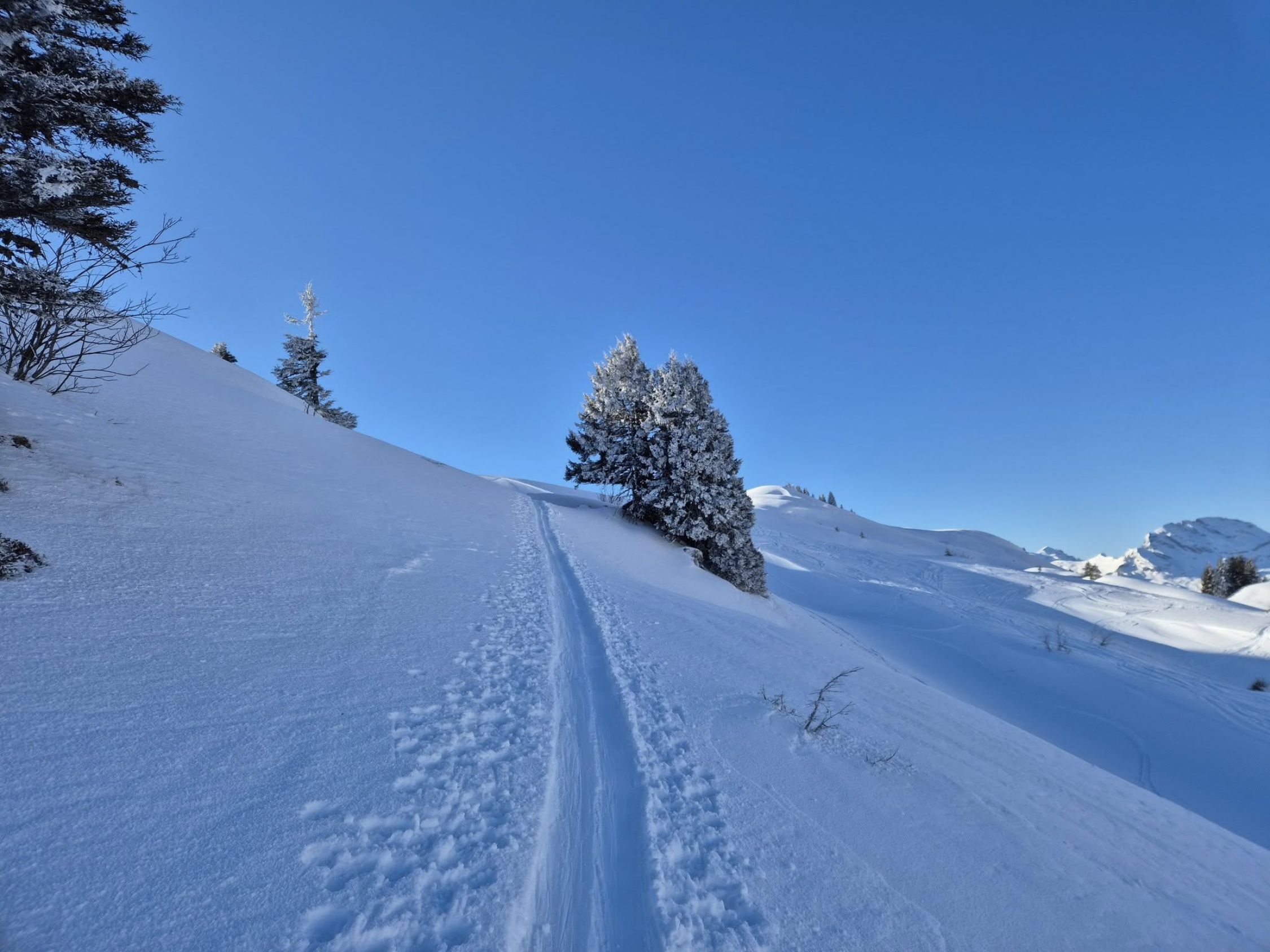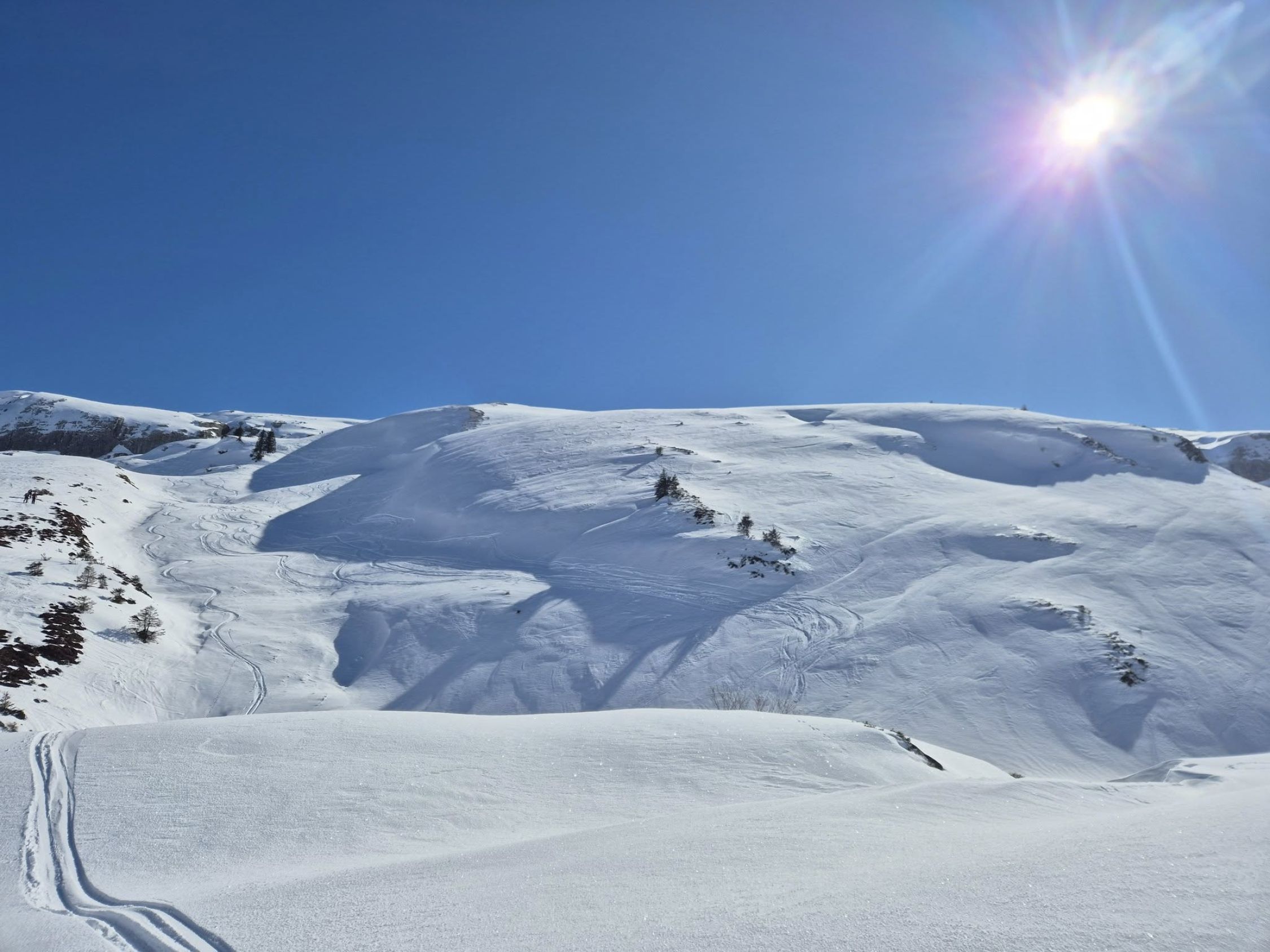 Die schwyzer Ecke soll am meisten Neuschnee erhalten haben, welchen wir auch gefunden haben, sofern er nicht vom Wind bearbeitet wurde. Unten im Schatten noch gut, an der Sonne gedeckelt. Erstaunlicherweise waren wir um 7.00Uhr die ersten. Für das Ausgezeichnet muss man etwas Gespühr für die richtigen Stellen mitbringen.