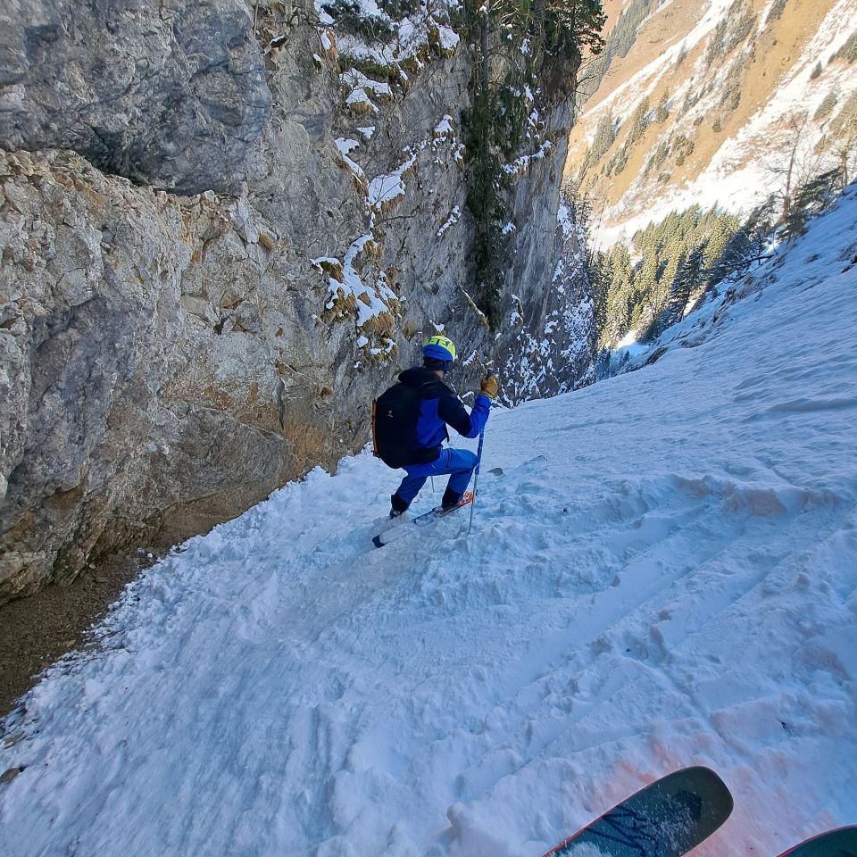 Nach Ecri Culi noch angehängt. Guter Trittschnee in Rinne,etwas unregelmässig,hatte schon etwas Abgangsschnee von Seite,Ausstieg (20m)eisig auf Felsplatte-heikel,gelassen)Abfahrt oben etwas ruppig, gemischt ,ab Mitte tip top Puder und tief,etwas Sluff-sehr gut.und macht man eh wegen Ambiente...