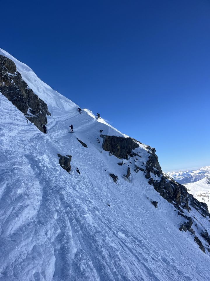 Abfahrt - Machbar: Von dem Powder am 28.02. war leider nichts mehr übrig - Windharsch von oben bis unten, oft recht mühsam zu fahren, manchmal tragend. Am Frühstücksplatz sind wir abgefahren, ging ganz gut, aber manche sind auch abgestiegen. Abfahrt dauerte ca. 45min und fühlte sich ziemlich anstrengend an.