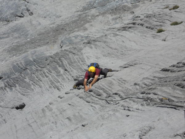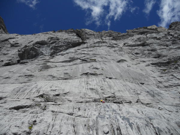 Die Tour ist spielt sich anhaltend im 6b-Gelände ab, dementsprechend braucht es Zeit und lange Tage. Früher in der Saison ist wohl auch der Bergschrund besser zu überwinden. Solange aber auf den Bändern im oberen Wandteil noch Schnee liegt, besteht die Gefahr von Steinschlag, und auch Schmelzwasser kann stören. Eine Begehung ist nur bei sicherem Wetter (keine Gewitter, kein Nebel) anzuraten.