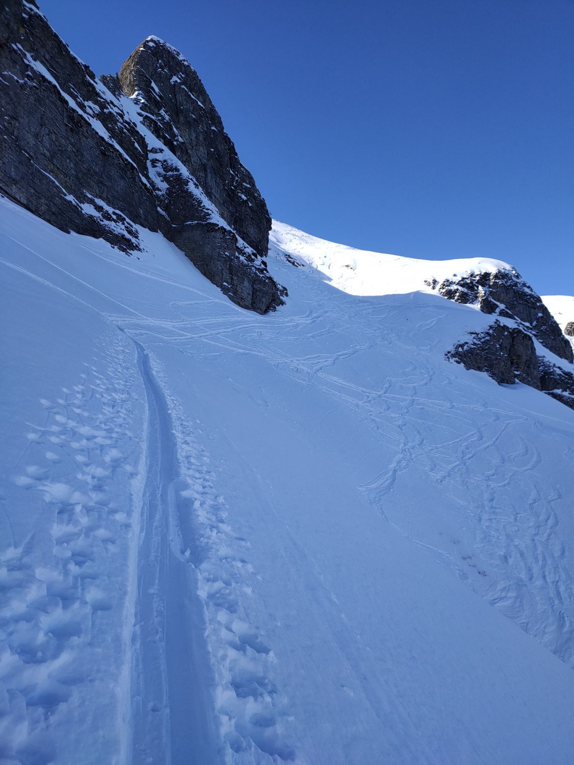 An sonnenexponierten Stellen dann erwartungsgemäss Hart und unangenehm (ca 11Uhr), ganz unten ziemlich aper, aber mit den Verhältnisse oben ist es mehr als entlohnt.