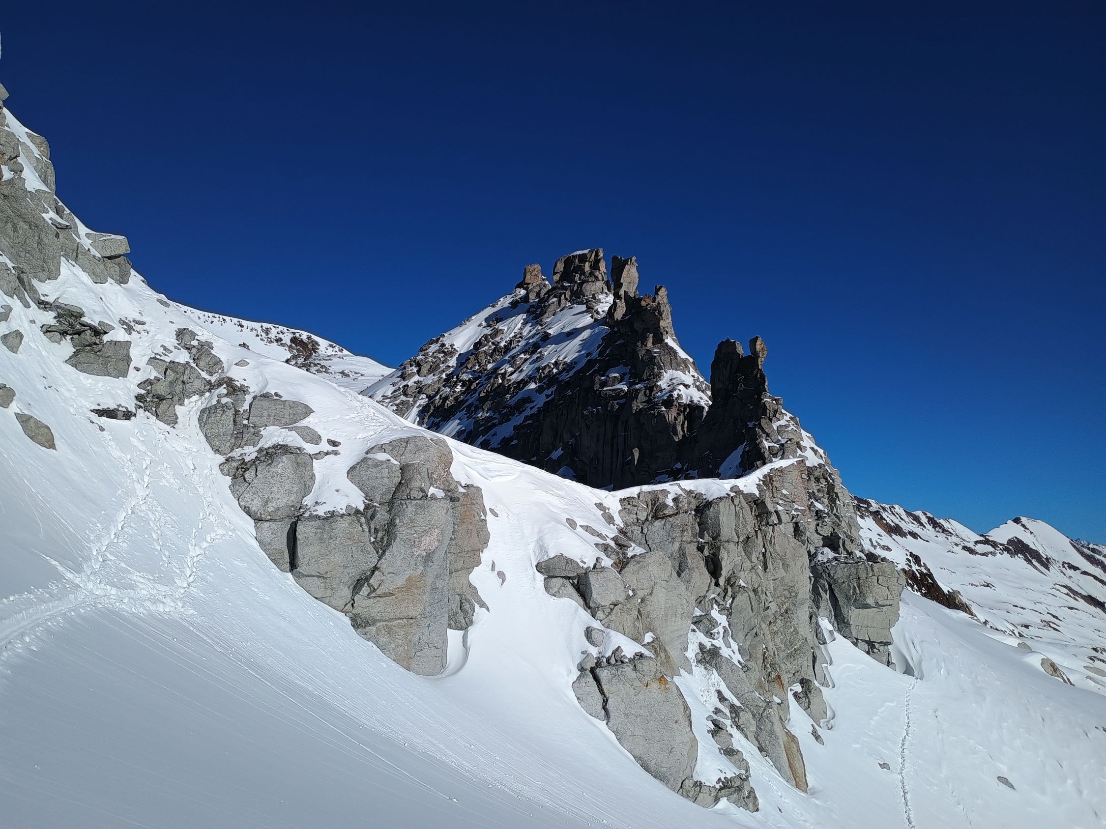 Direktaufstieg wurde gemacht, uns war es zu steil und rutschig (10-20cm Pulver auf rutschiger Unterlage). Sind dann um den Pfeiler rum und das ging super angenehm. Es gibt einen kurzen aber sehr unangenehmen Durchschlupf zum Gipfel Plateau.