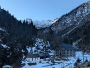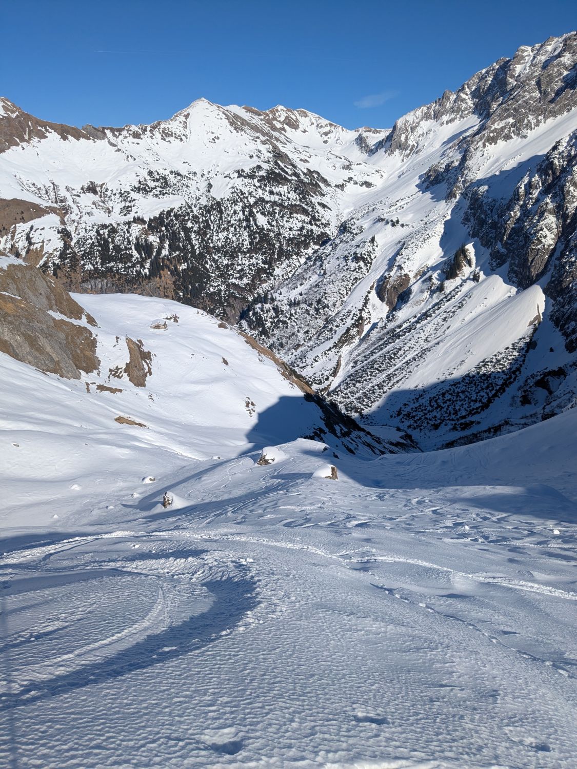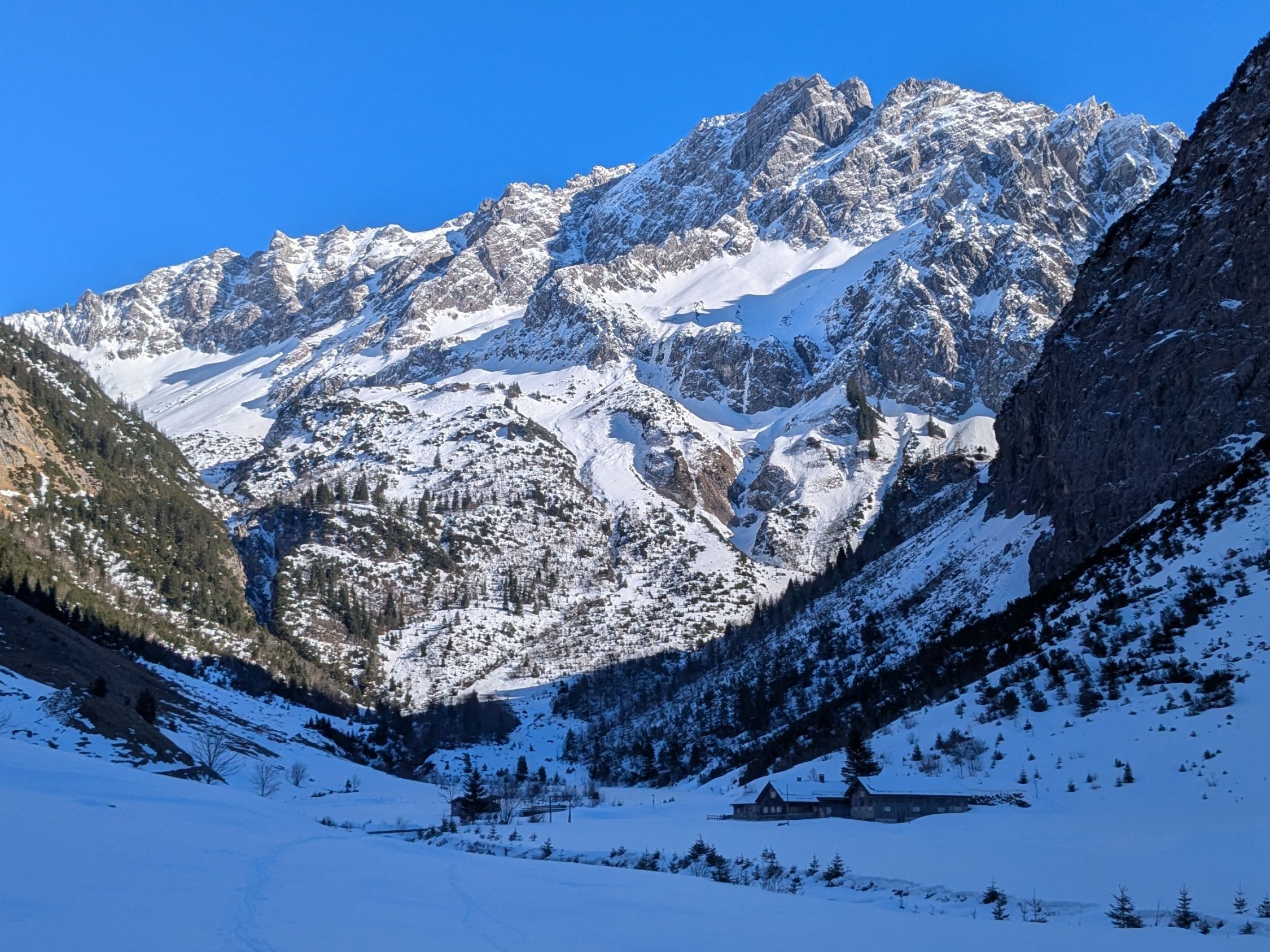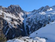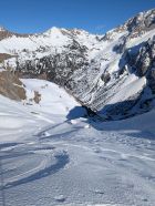 Sehr gute Verhältnisse oberhalb von 1500 m, immer noch klasse Pulver. Bis Gadenalpe muß man tragen und auch danach immer noch große Lücken. Ab 1450 m Höhe durchgehend Schnee. Bin nach dem Misthaufen noch auf die Schwarze Wand. Von dort Superabfahrt zum Mutterwangjoch (kleiner Gegenanstieg), dann nochmal 800 m Metzgertobel, wobei dort die unteren 200 m bis zum Beginn des Alpweges hart und ruppig sind. Die Güterstraße talaus hat nur bei Heimenwald eine größere Lücke. Kurz nach dem Wasserfall kann man aktuell fast noch bis zum Parkplatz mit Ski fahren.