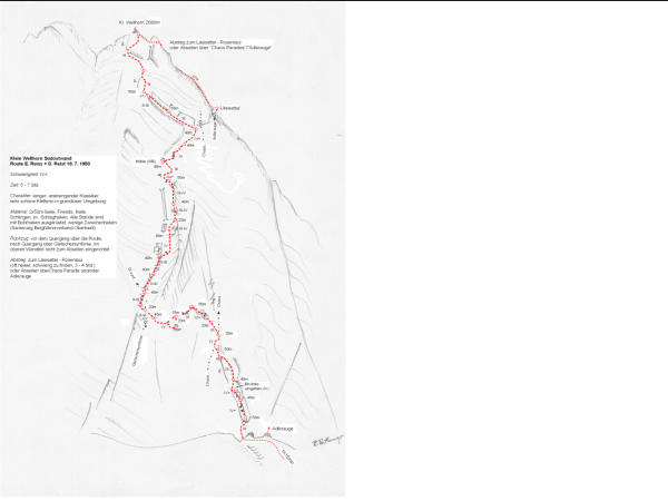 Es soll hier nochmals die grossartige Leistung von Dölf Reist und Ernst Reiss aus dem Jahre 1950(!) gewürdigt werden! Man denke sich beim Klettern die Bohrhaken und moderne Kletterausrüstung weg und stelle sich vor, wie die zwei beim ersten Versuch beim grossen Quergang mit Abseilstelle nach 13 Stunden Kletterei scheiterten. Es folgte eine haarsträubende Abseilfahrt im Überhängenden per Dülfer am Hanfseil. Erst nach nochmaliger intensiver Prüfung der Stelle aus der Ferne haben die zwei den Weiterweg im zweiten Anlauf gefunden. Die Erstbegehung ist in seinem Buch "Mein Weg als Bergsteiger 1962" lebhaft beschrieben.