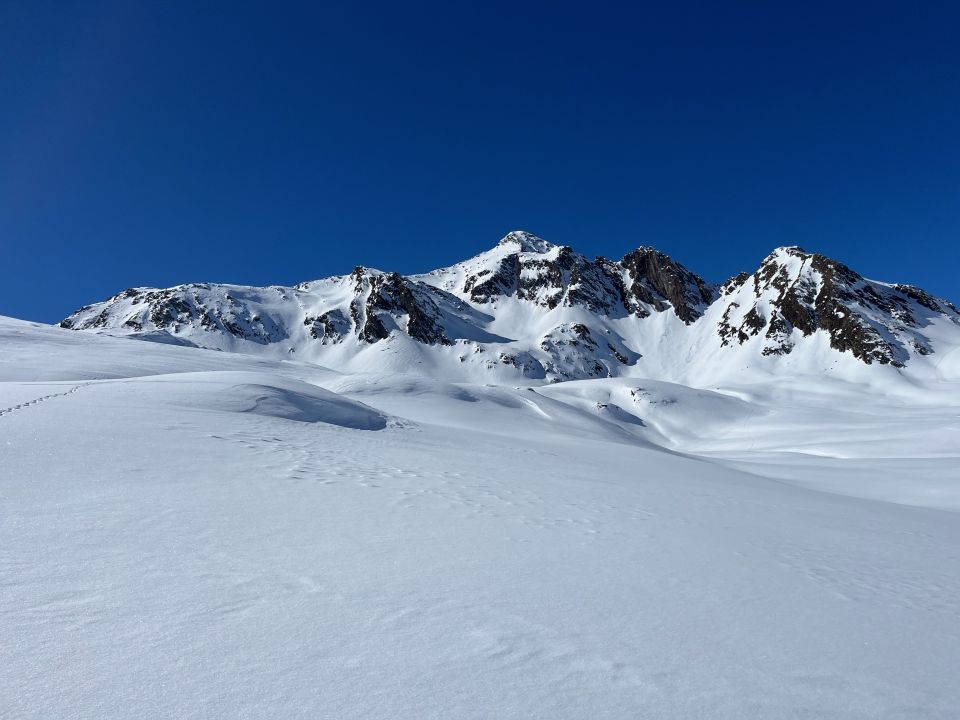Genug Schnee ab Start. Anfangs harte Piste, von Schneeschuhgängern ausgetreten. Ab Lago di Cane 2 frische Spuren, eine links dirket, eine rechts wie in der Skitourenkarte, wir nahmen die linke. Im Anstieg zu Le Pipe ab Pass steinige Passage, wir haben ca. 20 Hm getragen. Danach wieder sehr schön, mit wenig frischem Schnee bis Skidepot. Der Aufstieg dann etwas heikel, Steigeisen und Pickel obligatorisch, an einer Stelle wäre evtl. auch Seil hilfreich.