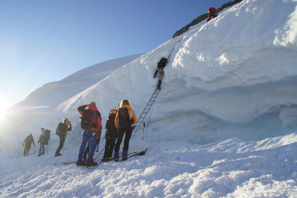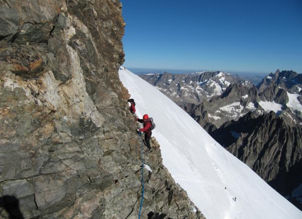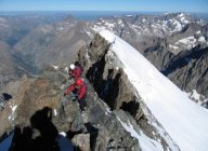 Aus der Breche Lory gibt es zwei Möglichkeiten: gerade hoch, ca. 10 m IV oder im Eis nach links queren (1 Haken am unteren Rand der Felsen), bis über leichtere Felsen die linke Kante erreicht werden kann. Schlüsselstelle, auf den Hauptgipfel gehen wegen dieser Stelle nur etwa 10 % der Aspiranten, so dass am Grat relative Ruhe herrscht.
