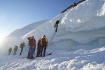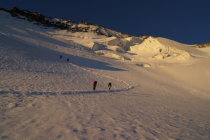 Gletscher noch gut eingeschneit, im Aufstieg trittfest, beim Abstieg unten weich. Fels annähernd schneefrei.