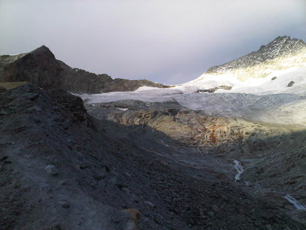 Gletscher den Temperaturen entspr. etwas tiefer Schnee, speziell im oberen Bereich spaltig.