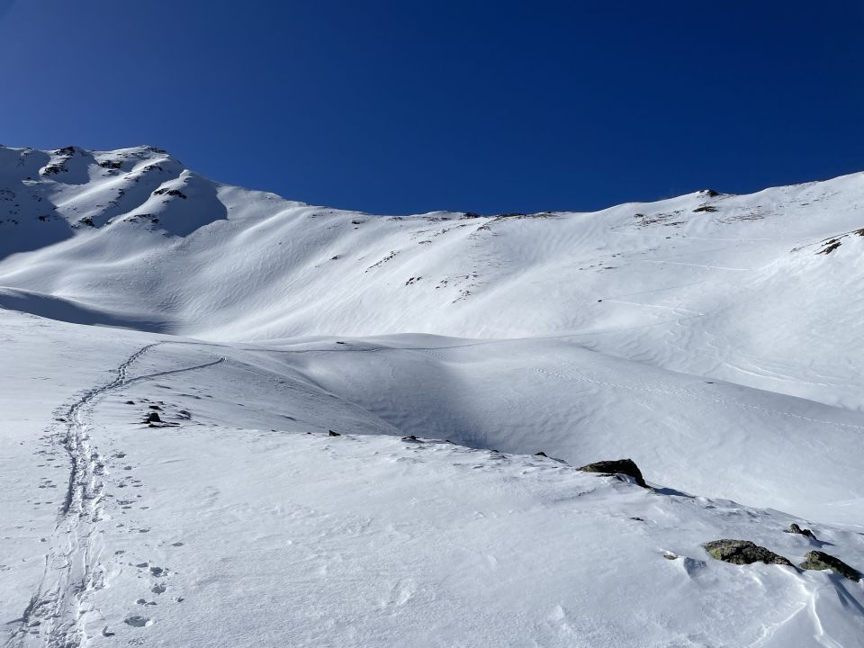 Aussichtsreicher Gipfel mit Blick über das nordwestliche Ramosch bishin zur östlichen Silvretta und über die Samnaungruppe. Die Route durch das kurze Valtelangtal mit dem Tobel Rio Valmiur (Falmierbach) ist für SS-Läufer vielleicht im Gegensatz zu Skitourengeher keine Empfehlung, da orientierungsbedürftig, wenn keine Spuren sichtbar sind und die nordseitigen Lärchenwaldhänge oberhalb der Bachüberquerung bis ca. 30° steil sind.