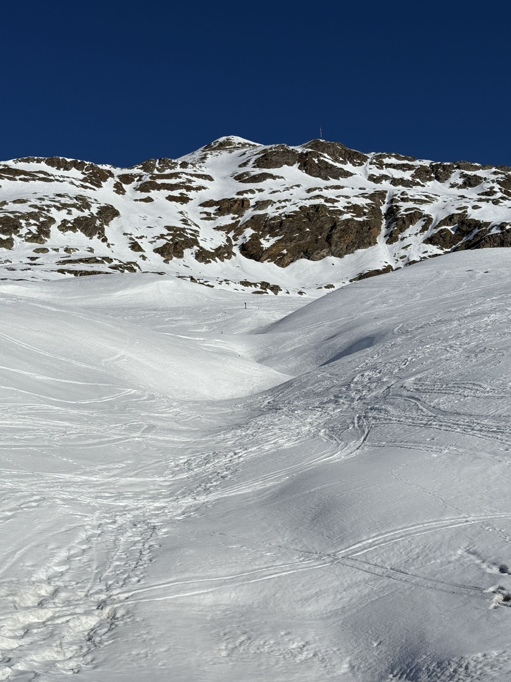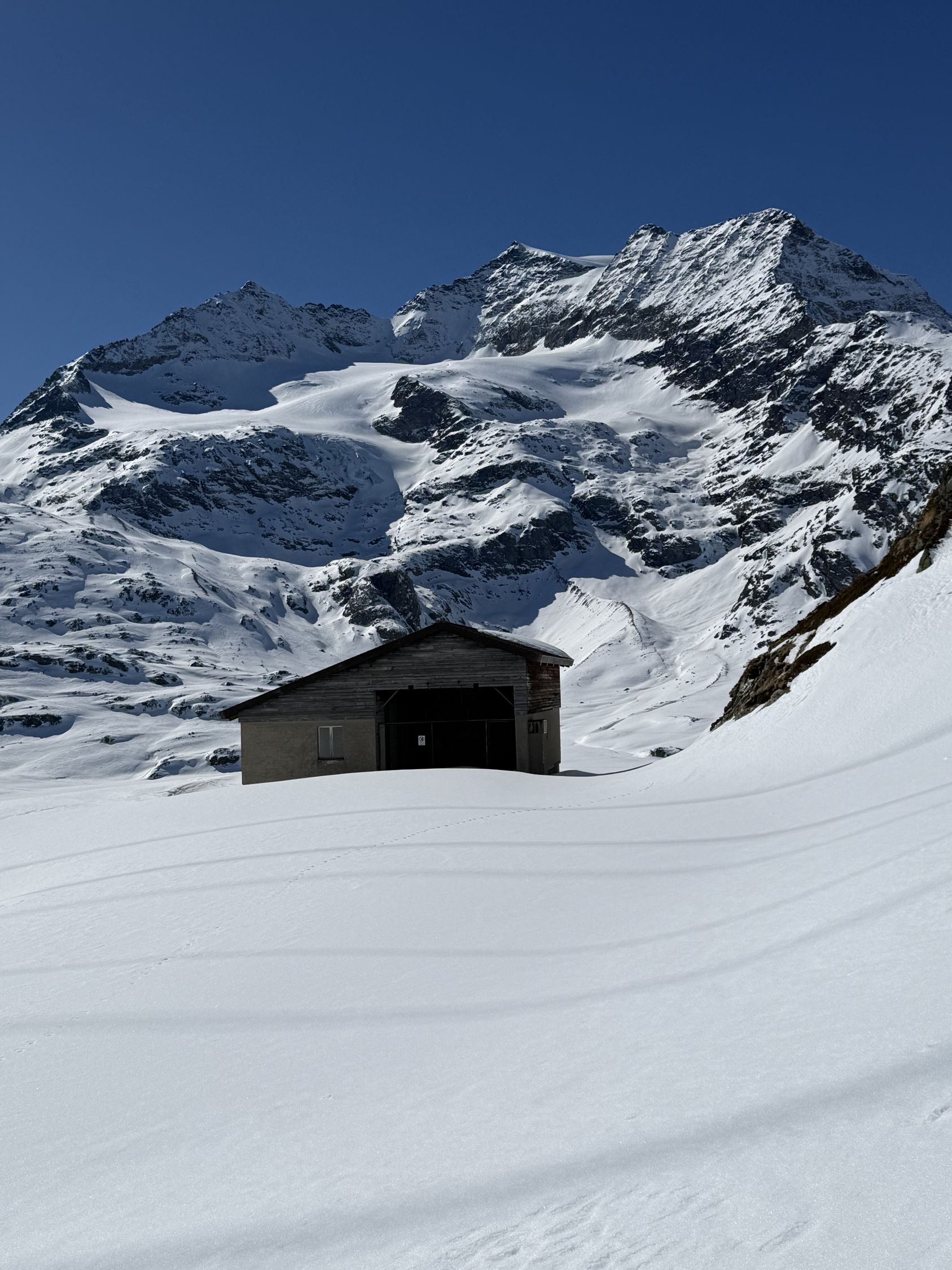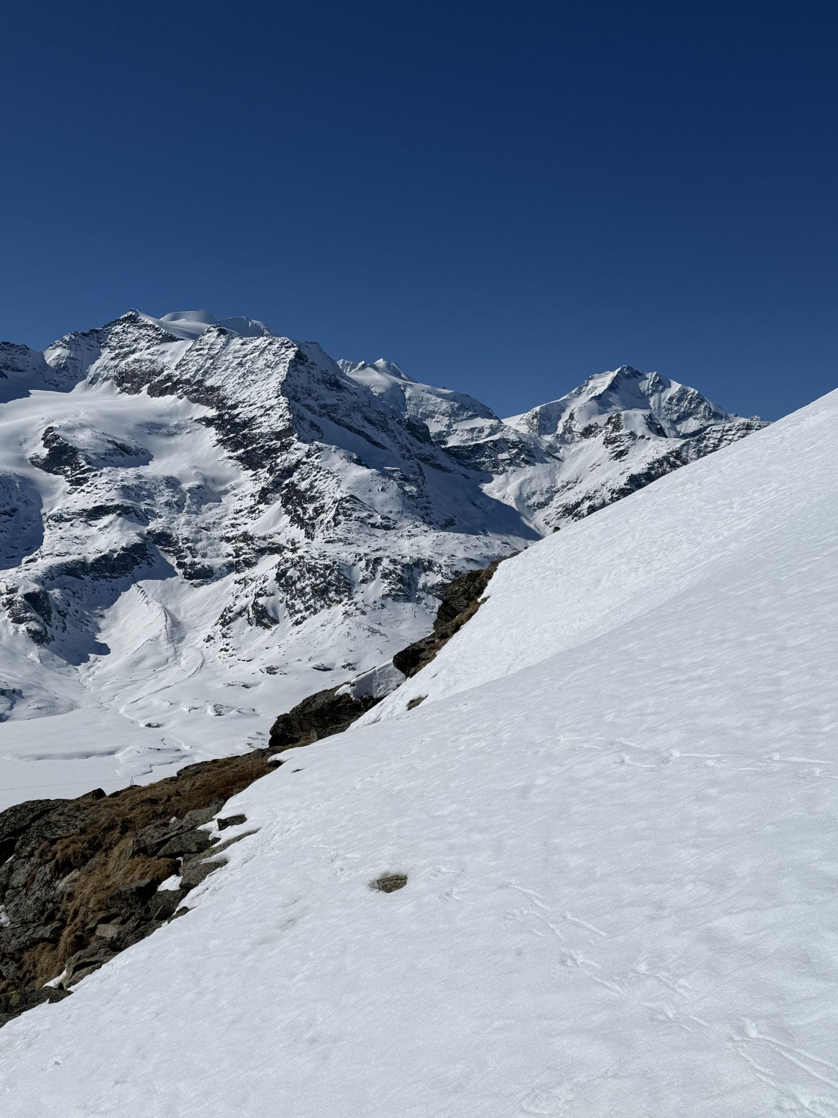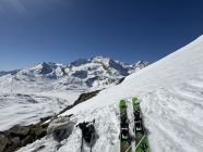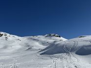 Frühlingstour auf die Südostflanke Piz Lagalb oberhalb Motta Bianca mit toller Aussicht. WS. Start Parkplatz Kurve unterhalb Ospizio Bernina 9.10, minus 5 Grad, fast windstill. Alles pickelhart bis Höhe 2700, hier Skidepot und Abfahrt nach Lunch. Die Flanke Lagalb Firn, nachher alle möglichen Schneearten, Hartschnee, Bruchharst, Firn und Sulz. Im unteren Teil schöner weicher Firn.