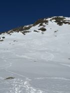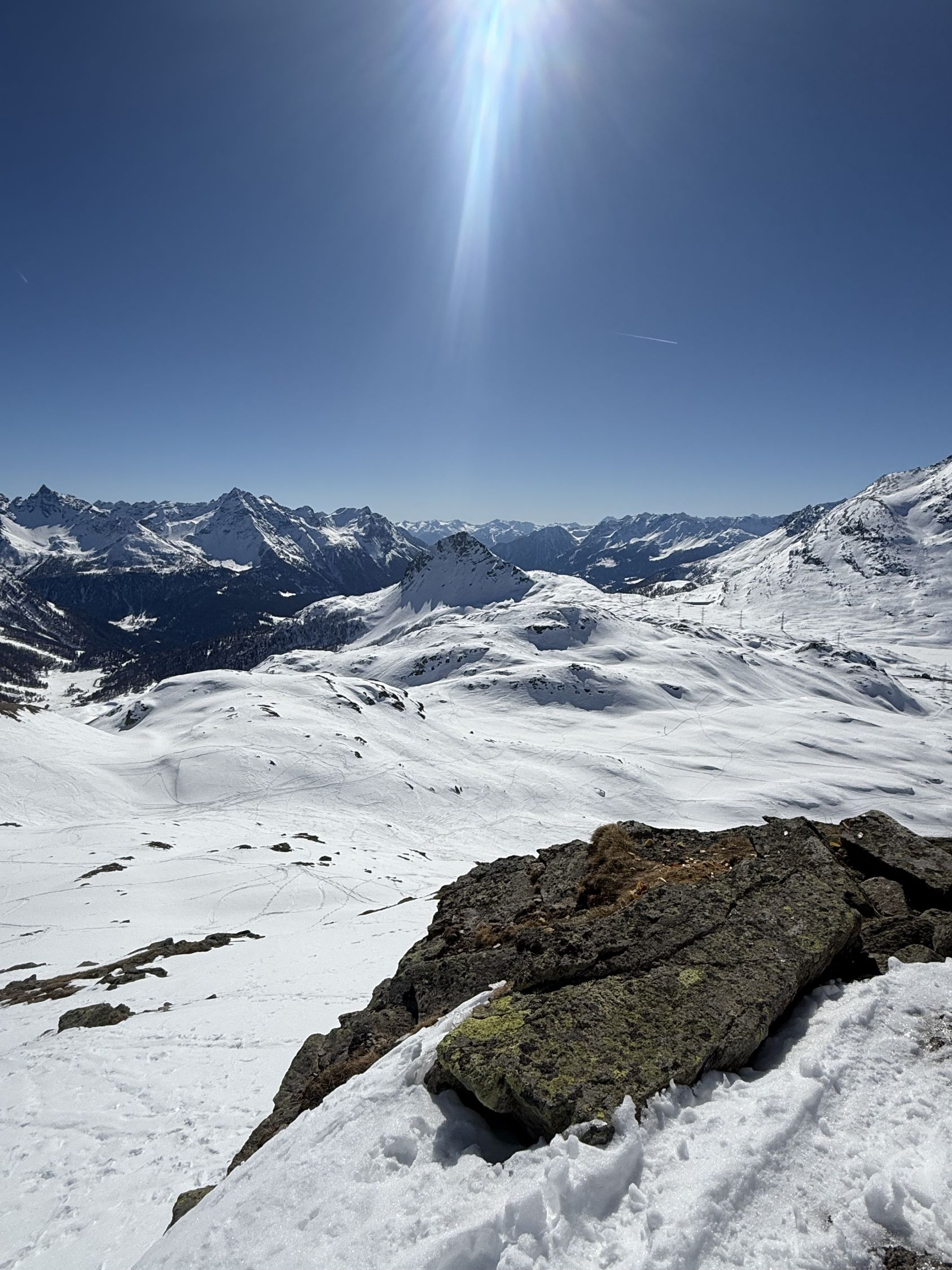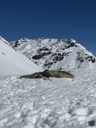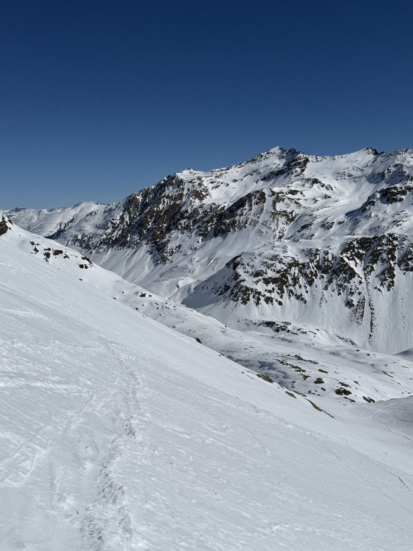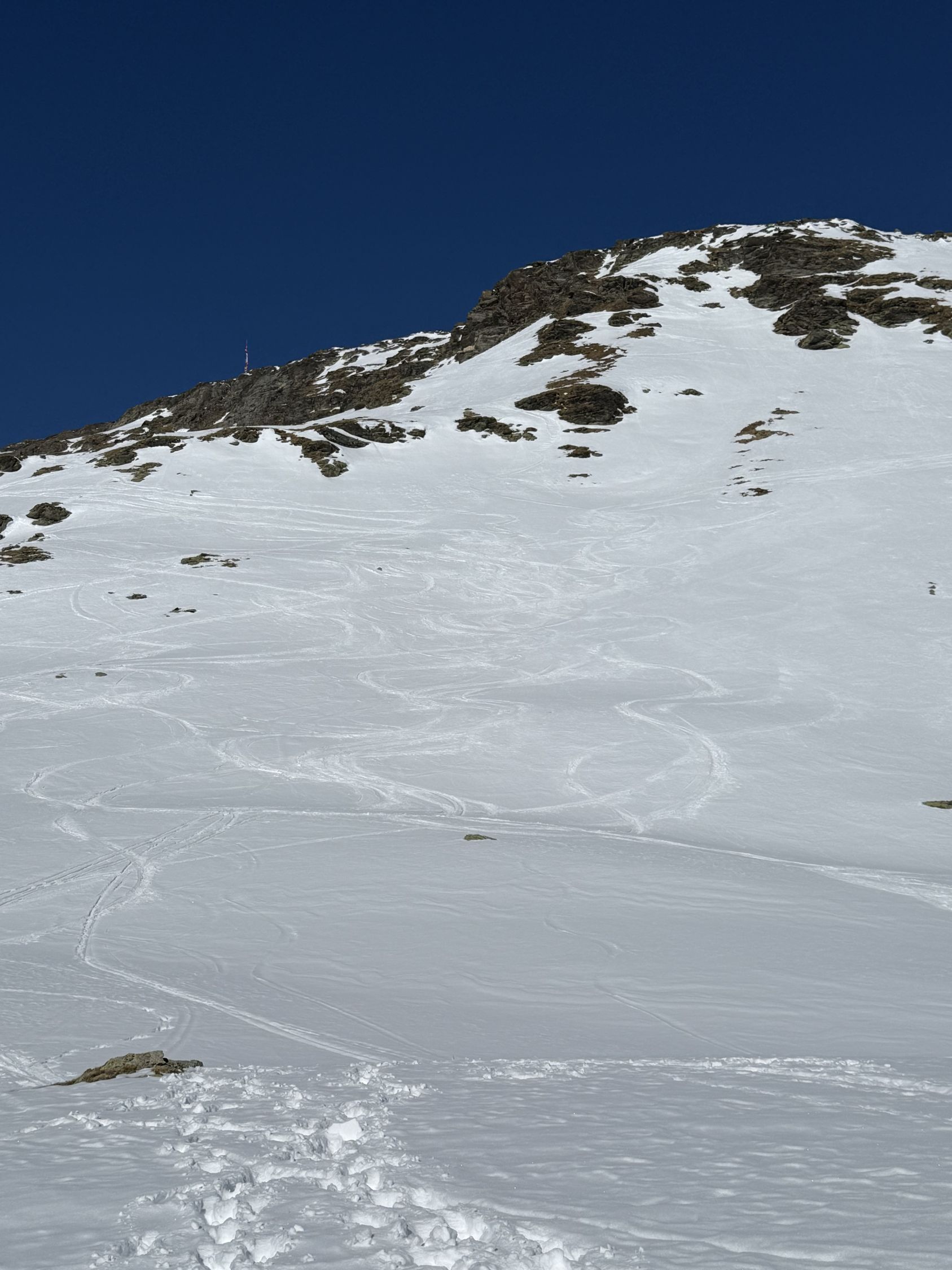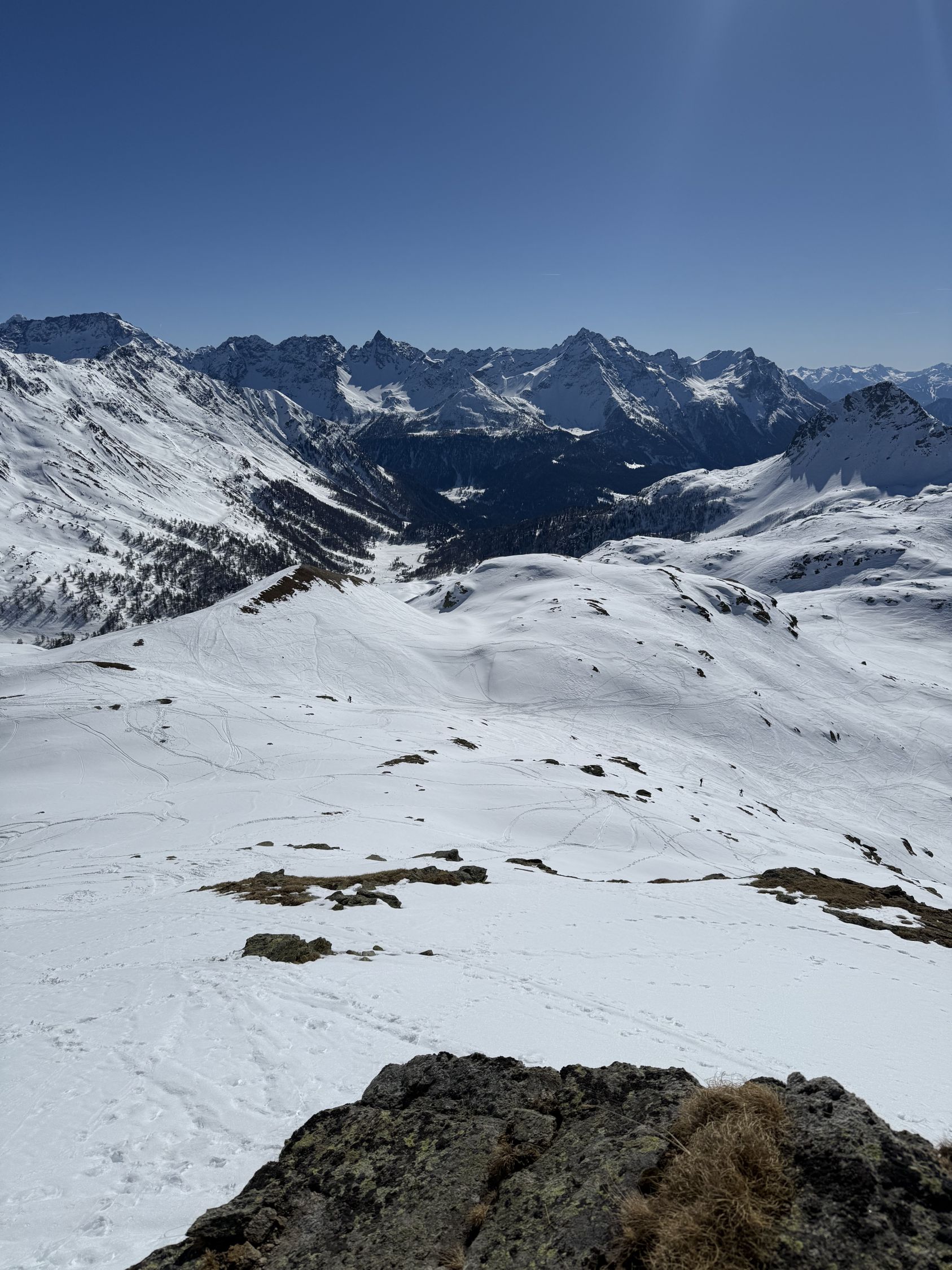 Frühlingstour auf die Südostflanke Piz Lagalb oberhalb Motta Bianca mit toller Aussicht. WS. Start Parkplatz Kurve unterhalb Ospizio Bernina 9.10, minus 5 Grad, fast windstill. Alles pickelhart bis Höhe 2700, hier Skidepot und Abfahrt nach Lunch. Die Flanke Lagalb Firn, nachher alle möglichen Schneearten, Hartschnee, Bruchharst, Firn und Sulz. Im unteren Teil schöner weicher Firn.