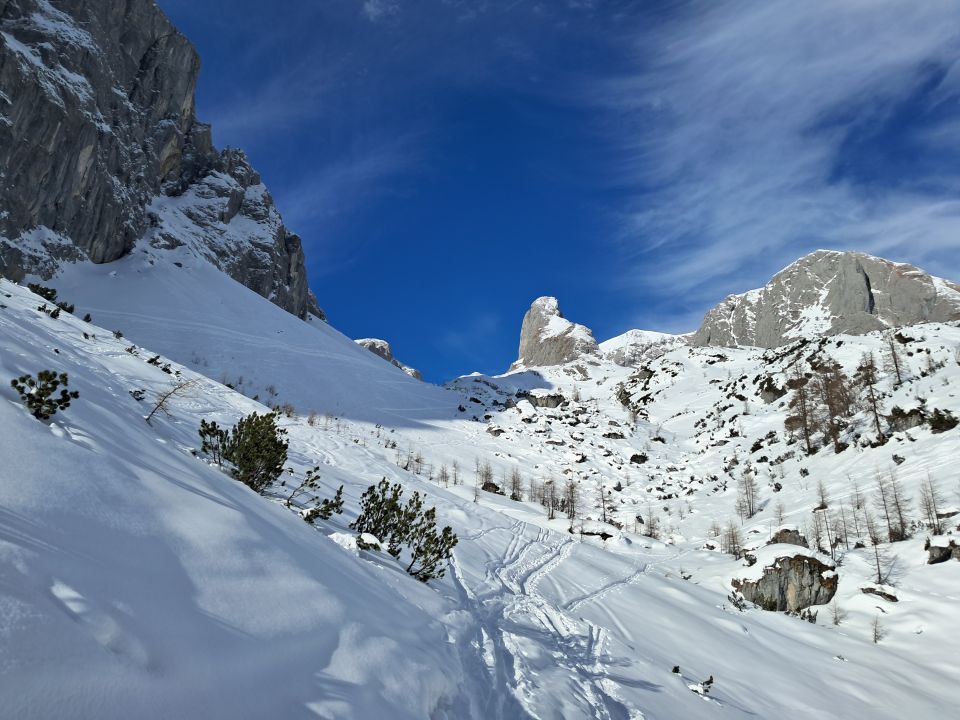 Bis zur Mitterfelder Alm auf und ab und immer wieder tragen ( wenig Schnee, runter natürlich dasselbe). Danach alles in ungedeckeltem Pulver!, natürlich teilweise schon zerfahren. Eine landschaftlich ganz großartige und lange Tour, als Skitour muss man wissen, worauf man sich einlässt - so manches Auf und Ab auf der Karsthochfläche und auch unten. Trotz teilweise tiefem Pulver auch wiederholter Steinkontakt, teilweise überschneit.